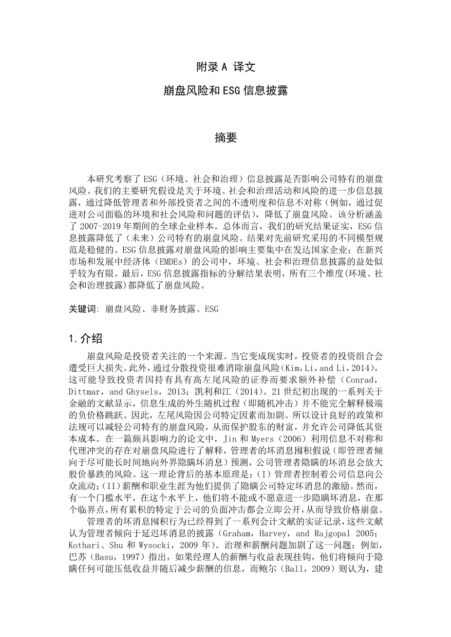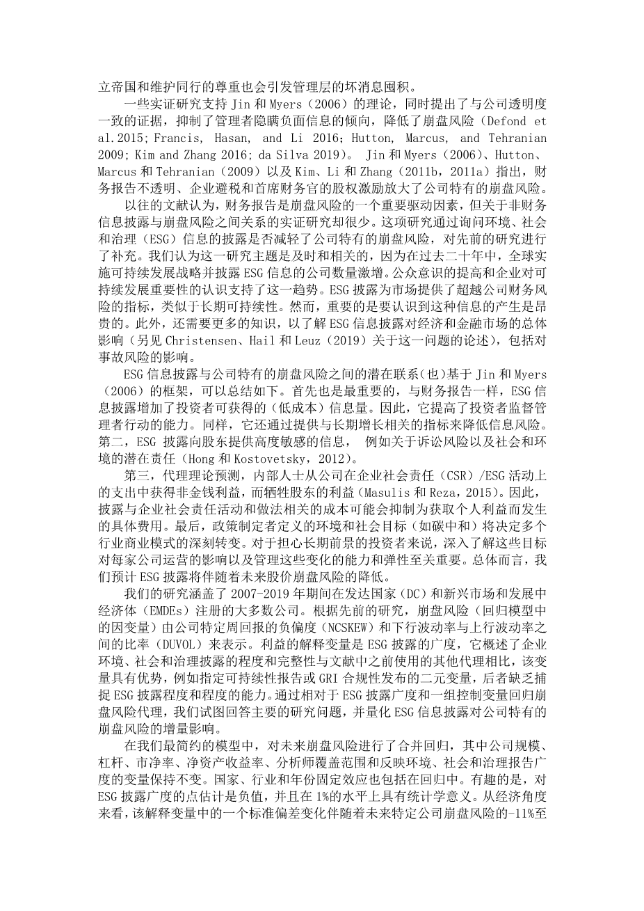 Financial reporting was established as a prominent driver of crash risk by prior literature, but empirical research on the association between non-financial disclosure and crash risk is scant. This study adds to previous research by asking whether the disclosure of environmental, social and governance (ESG) information alleviates firm-specific crash risk. We consider this topic of research timely and relevant because the number of firms implementing sustainability strategies and disclosing their ESG information surged globally over the last two decades. Growing public awareness and corporate acknowledgment of the importance of sustainable development supported this trend. ESG disclosure provides the market with metrics that go beyond a firmrsquo;s financial risks and which are akin to long-term sustainability. However, it is important to realize that the production of such information is costly. Also, more knowledge is desirable to understand the overall impact on the economy and financial markets of ESG disclosure (see also Christensen, Hail, and Leuz (2019) on this issue), including effects on crash risk.