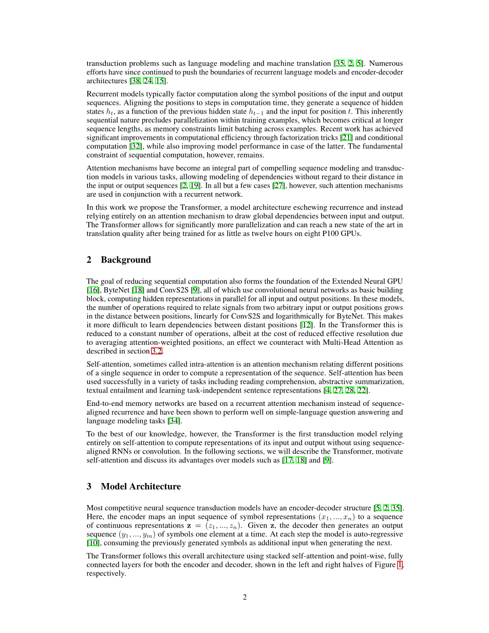 然而,据我们所知,Transformer是第一个完全依靠self-attention的转换模型来计算其输入和输出的表示,而不使用序列对齐的RNN或卷积的模型。在接下来的部分中,我们将描述由self-attention驱动的Transformer,并且讨论与其他模型相比,其优势所在。