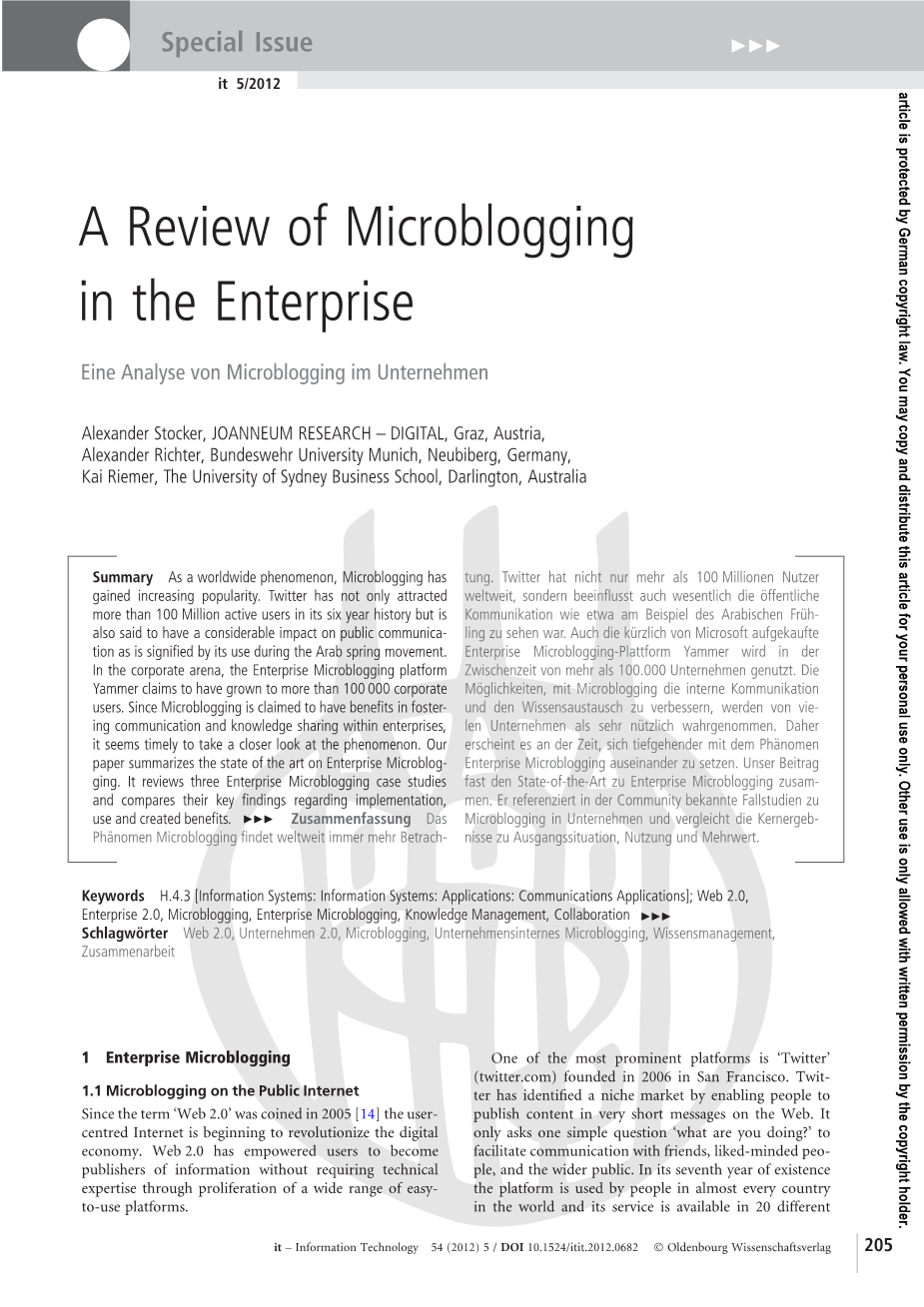 摘要 微博作为一种世界性的现象,越来越受到人们的欢迎。Twitter在其6年的历史中不仅吸引了超过1亿的活跃用户,而且据说对公众传播产生了相当大的影响,这一点从它在阿拉伯之春运动中的使用可以看出。在企业领域,企业微博平台Yammer声称已经拥有超过10万企业用户。既然微博被认为有利于促进企业内部的交流和知识共享,现在似乎是时候对这一现象进行更深入的研究了。本文对企业微博的发展现状进行了总结。它回顾了三个企业微博案例研究,并比较了它们在实现、使用和创造效益方面的关键发现。
