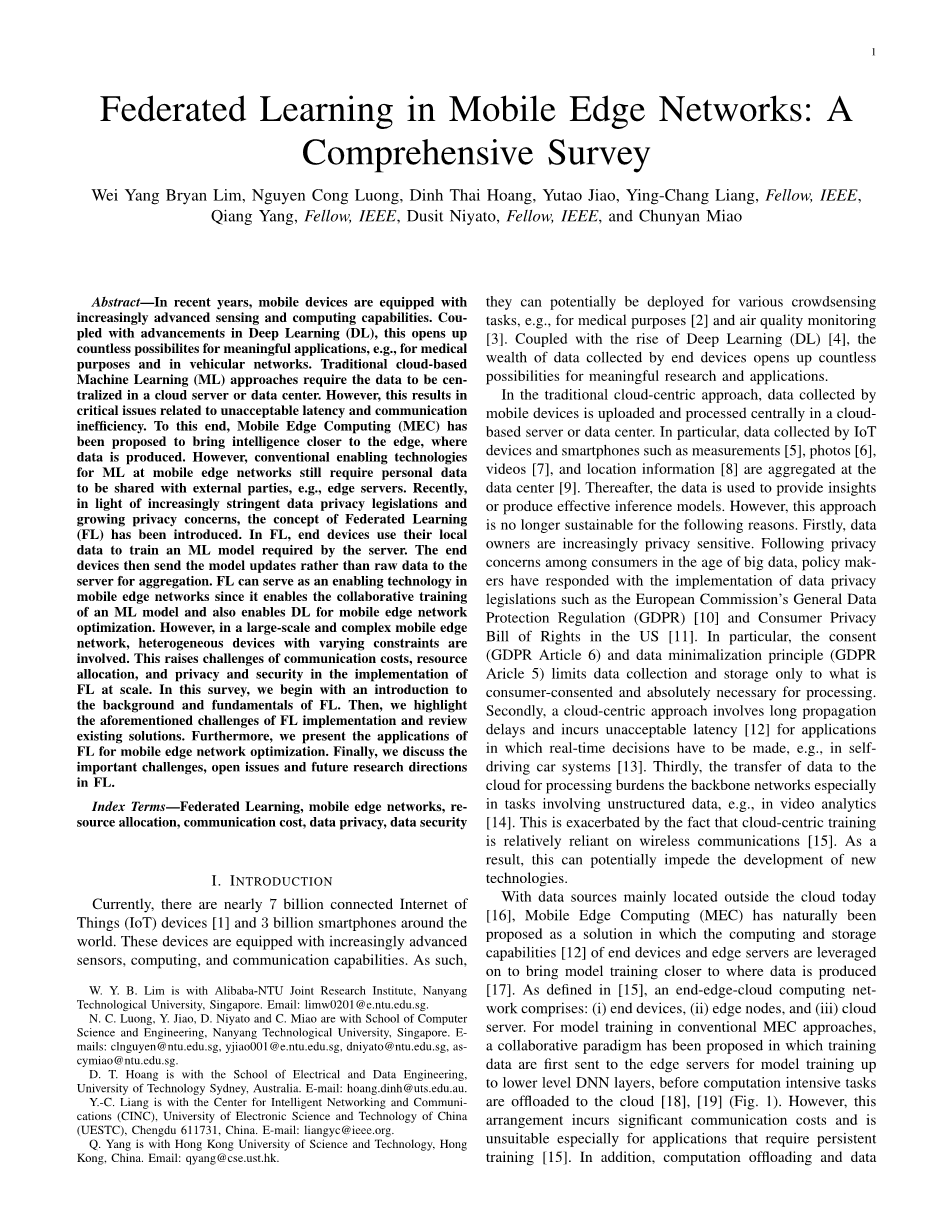 最近一段时间,继深度学习在诸如计算机视觉(CV)[41]和自然语言处理(NLP)等几个领域的成功运用并发展后,人工智能(AI)已经成为我们生活的一个重要组成部分。在传统的深度神经网络(DNNs)训练中,采用了一种基于云的方法,在强大的云服务器中进行数据集中和模型训练。然而,考虑到传感和计算能力越来越先进的移动设备的广泛存在,自然出现了智能从云端到边缘的迁移,就是移动边缘计算模式。此外,由于对隐私的顾虑越来越多,致使人们提出了联邦学习的概念。