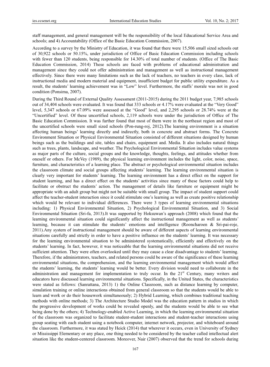 在2011预算年度的第三轮外部质量评估(2011-2015)期间,评估了34,404所学校中的7,985所学校。结果发现,333所学校或4.17%被评为“非常好”,5,347所学校或67.09%被评为“良好”水平,2,295所学校或28.74%处于“未经认证”水平。在这些未经认证的学校中,有2,119所学校由基础教育委员会办公室管辖。进一步发现,他们大多数都在东北地区,大多数未经认证的学校都是小型学校(Pon-rung-roj,2012)。学习环境是一种直接或间接影响人类学习的情境。具体和抽象的形式。具体的环境状况或物理环境状况包括人类设计的不同情况,如建筑物和场地,桌椅,设备和。媒体。它还包括树木,植物,风景和天气等自然物。心理环境状况包括价值体系作为文化的主要部分,社会群体以及来自自己或他人的知识,思想,感受和态度。对于McVey(1989),物理学习环境包括学习场所的光线,色彩,噪音,空间,家具和特征。抽象或心理环境状况包括影响学生学习的课堂气氛和社会群体。学习环境状况对学生的学习显然非常重要。学习环境对学生学习的支持有直接影响,并直接影响学生的活动,因为这些因素中的许多因素可能有助于促进或阻碍学生的行动。家具或设备等细节的管理可能适合成人组,但可能不适合小组。学生支持的影响可能会影响师生互动,因为它可以激发学生的学习,并创造与个体差异相关的积极关系。有3种学习环境情况,包括:1)物理环境状况,2)心理环境状况,3)社会环境状况(Sri-fa,2013)。它得到了Hoksuwan的方法(2008)的支持,该方法发现学习环境状况可能会显着影响教学管理以及学生的学习,因为它可以激发学生的情感和智力(Rooncharoen&Sri-pai-roje,2011)任何教学管理制度都应认真,严格地了解学习环境的各个方面,以对学生的学习产生积极影响。学习环境状况必须系统,有效,有效地管理学生的学习。然而,事实上,学习环境情况没有得到足够的重视是显而易见的。他们经常被忽视,直到他们可能对学生的学习造成明显的不利。因此,如果管理者,教师和相关人员能够意识到这些学习环境状况,理解和学习环境管理对于影响学生学习的重要性,学生的学习会更好。每个部门都需要在管理和管理方面进行合作才能真正实现。在21ST 世纪,许多作家和教育家都在讨论学习环境问题。具体来说,在美国,其特征如下:(Sanrattana,2013)1)在线课堂,如通过计算机进行远程学习,模拟培训或从普通课堂获得的在线互动,以便学生能够学习同时工作或做家务; 2)混合学习,将传统教学方法与在线方法相结合; 3)建筑工作室模型是工作室的教育模式,其中作品的逐步发展可以公开展示,学生将能够看到其他人做了什么; 4)技术支持的主动学习,其中,课堂的学习环境状况被组织起来,以便使用笔记本电脑,互联网,投影仪和教室周围的白板,与每个学生使用小组座位来促进学生与学生之间的互动和学生与教师的互动。此外,Heick(2014)指出,即使在悉尼大学或密西西比小学或任何地方,无论发生在哪里,老师都需要考虑一件事,如学生为中心的教室,这种情况就像智能警报情况一样。此外,Nair(2007)观察了21世纪学校的发展趋势 甚至在悉尼大学或密西西比小学或任何地方,老师都需要考虑一件事,就像以学生为中心的教室那样的智力警报情况。此外,Nair(2007)观察了21世纪学校的发展趋势 甚至在悉尼大学或密西西比小学或任何地方,老师都需要考虑一件事,就像以学生为中心的教室那样的智力警报情况。此外,Nair(2007)观察了21世纪学校的发展趋势st世纪不仅是学习的地方,也是进入学习世界的门户,因为计算机随时可以在任何地方使用。可以访问无线网络和互联网,可以使用更密集的技术,并且将更加强调非正式学习。此外,家具的设计将更具想象力,更多的服务将被关注,与其他学校或大学的合作水平将会提高。