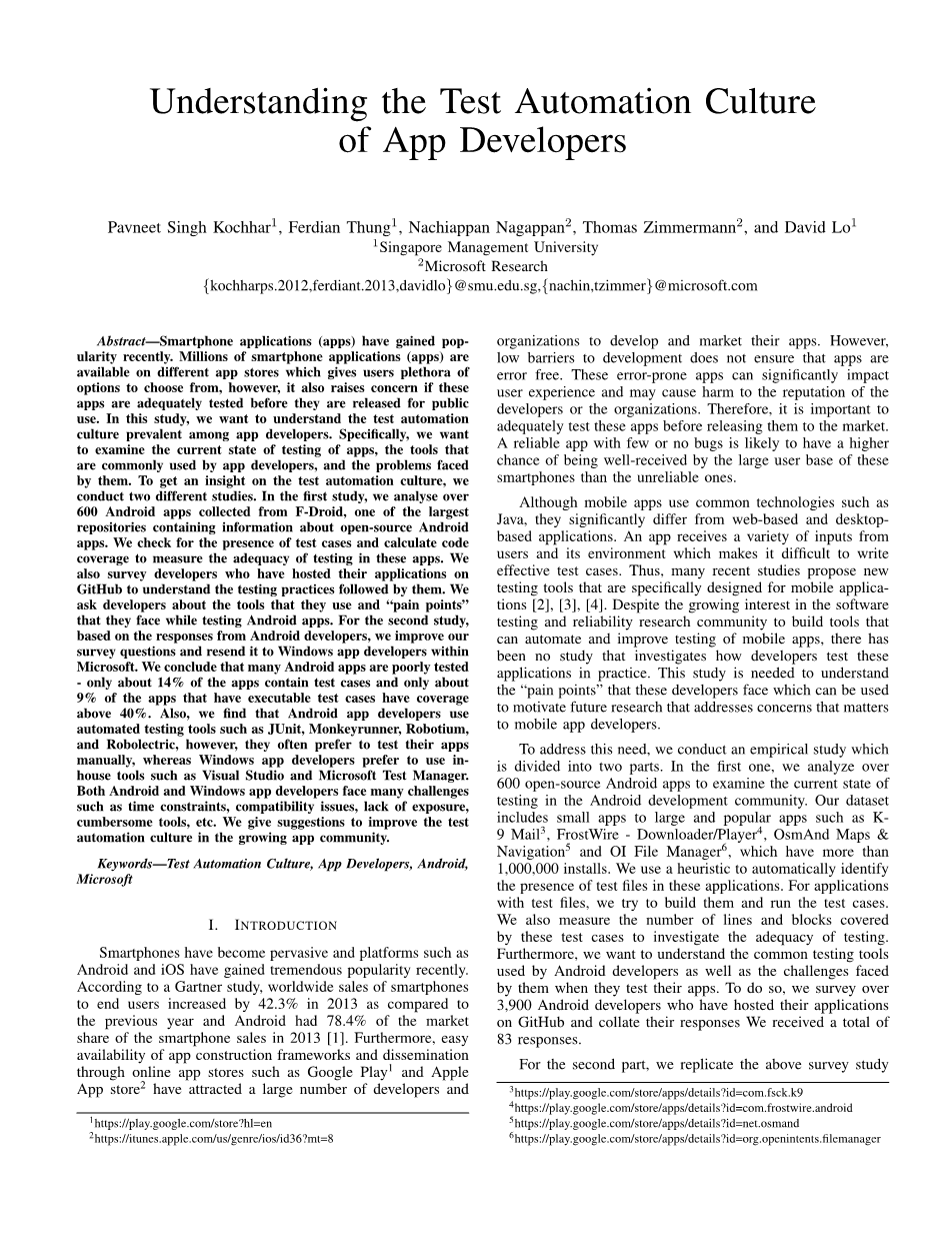 我们是第一个进行研究以了解 Android和微软应用开发社区的测试自动化文化的人。