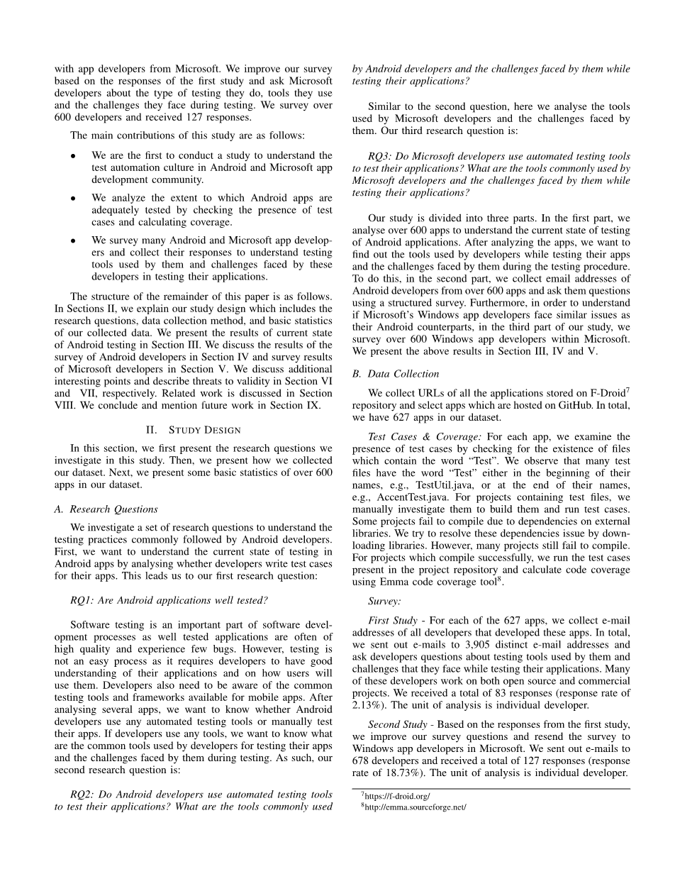本文其余部分的结构如下。在第二节中,我们解释了我们的研究设计,包括研究问题、数据收集方法和我们收集的数据的基本统计。我们在第三节中介绍了安卓测试的现状的结果。我们在第四节中讨论了对Android 开发者的调查结果,在第五节中讨论了对微软开发者的调查结果。
