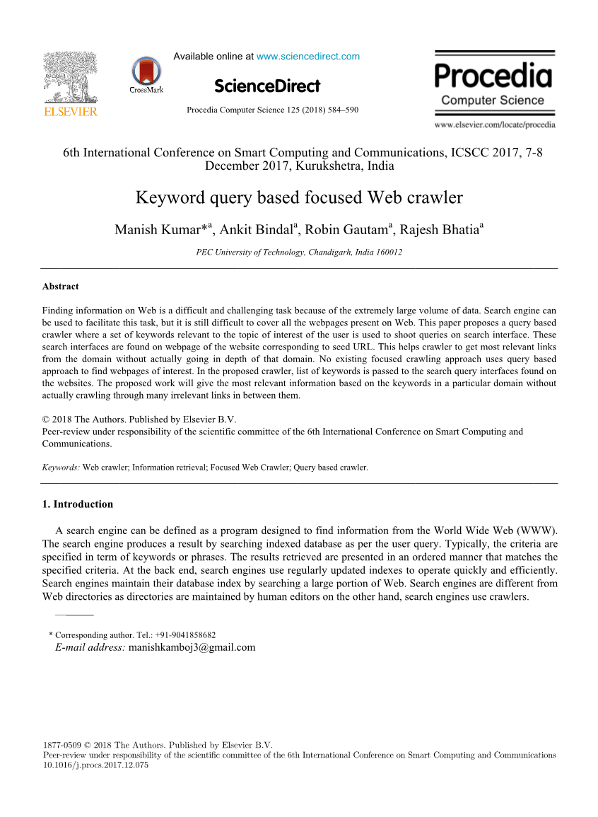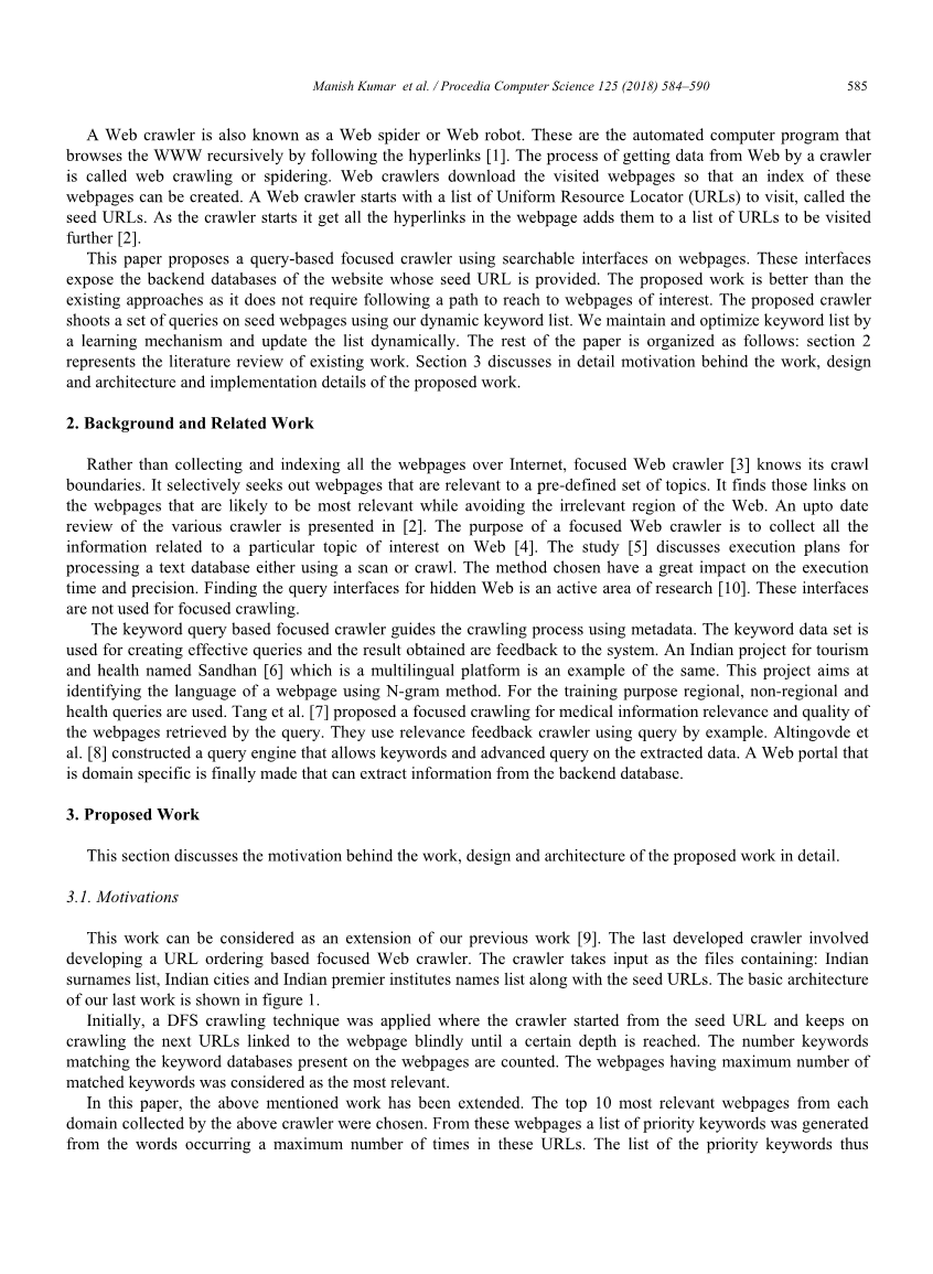 基于关键字查询的聚焦爬虫使用元数据来引导爬行过程。关键字数据集用于创建有效的查询,获得的结果反馈给系统。一个名为桑德汉[6]的印度旅游和健康项目就是一个例子,这个项目是一个多语言平台。该项目旨在使用N-gram方法识别网页的语言。出于培训目的,使用区域、非区域和健康查询。唐等。[7]提出了一种针对通过查询检索的网页的医学信息相关性和质量的聚焦爬行。他们使用相关反馈爬虫,通过示例进行查询。Altingovde等人。[8]构建了一个查询引擎,允许对提取的数据进行关键字和高级查询。最终形成了一个特定于领域的门户网站,可以从后端数据库中提取信息。3.拟议的工作