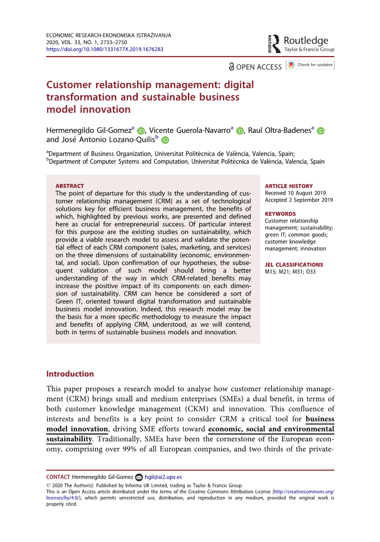 本研究的出发点是理解客户关系管理(CRM)作为一套技术解决方案,对有效的企业管理至关重要,先前的工作强调了CRM的好处,并将其定义为企业成功的关键。为此,对可持续性的现有研究尤其感兴趣,这些研究提供了一个可行的研究模型,以评估和验证每个客户关系管理组成部分(销售、营销和服务)对可持续性的三个维度(经济、环境和社会)的潜在影响。在确认我们的假设后,随后对该模型的验证应能更好地理解CRM相关利益如何增加其组成部分对可持续性各个维度的积极影响。因此,CRM可以被认为是一种绿色IT,面向数字化转型和可持续商业模式创新。事实上,这个研究模型可能是一个更具体的方法论的基础,以衡量应用CRM的影响和好处,正如我们将要讨论的,无论是在可持续的商业模式还是创新方面。