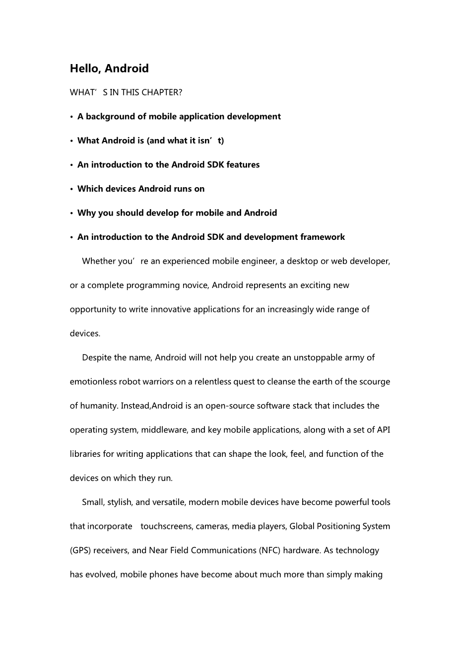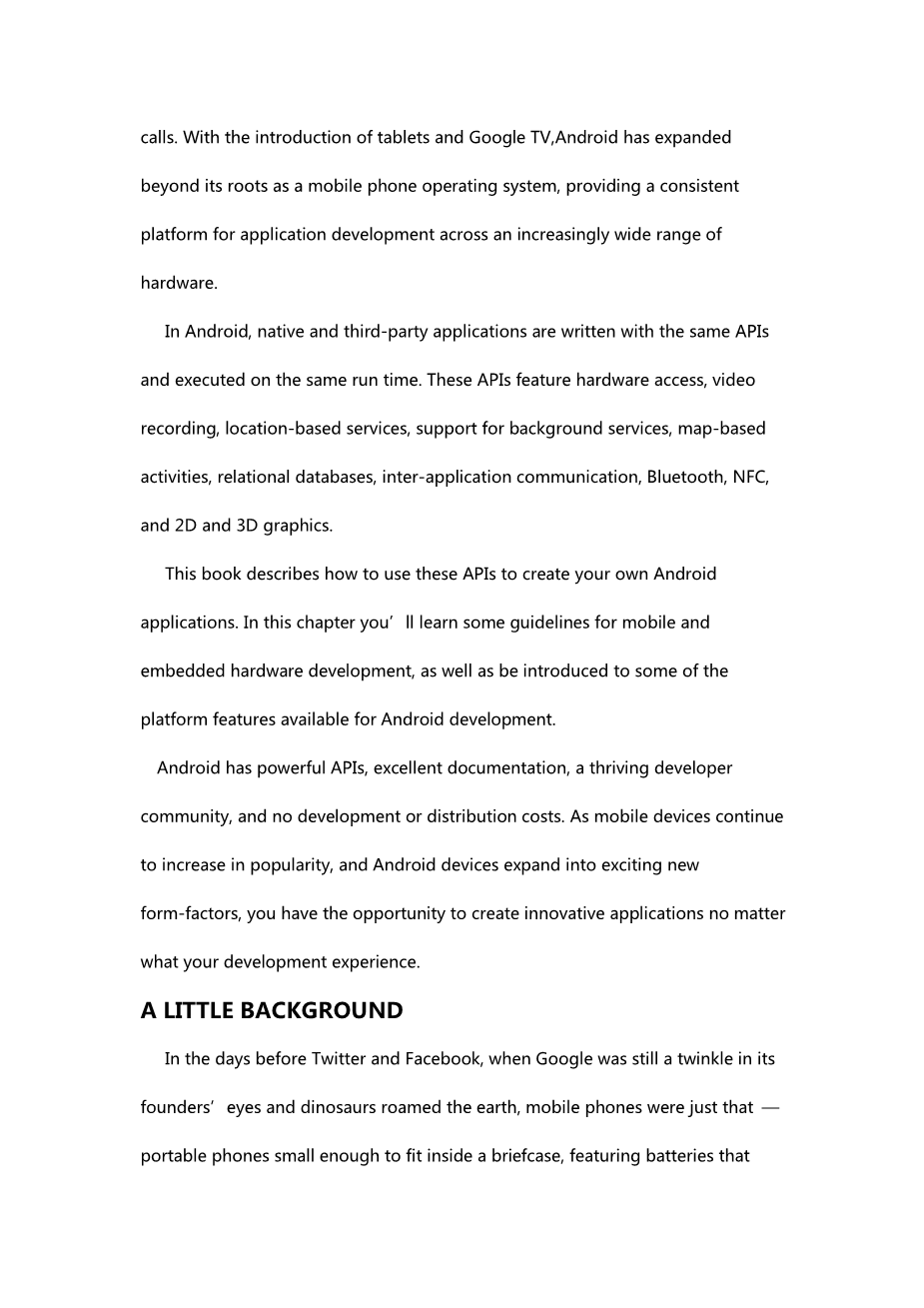 这本书描述了怎么样去使用这些API来开发自己的Android应用程序。在本章,你将会学到一些移动和嵌入式硬件开发的准则以及Android开发平台提供的一些功能。