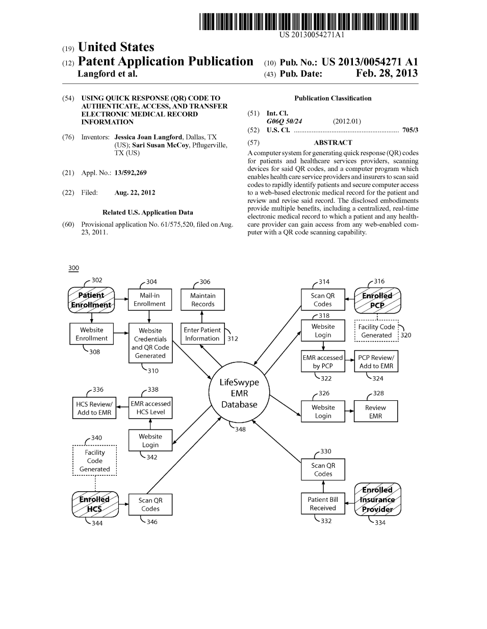 【0015】本公开提供了这样一个方法:首先计算机系统生成患者二维码,这个二维码由医院等相关机构的二维码识别电脑客户端第一次扫描。患者的二维码扫描完成之后,存在分配给该特定设施的二维码进行第二次扫描。此后,用户特定识别码和密码被输入,和一个安全基于互联网的连接到一个医疗机构的门户,通过该患者产生的电子病历可被访问。这个电子病历包括医疗信息,包括但不限于:个人信息,医疗史,过敏,保险信息,家庭成员,现有的药物,以及病人的医生的信息。电子病历可以进行审查,修订和授权方更新,包括病人,家属,护理人员,医生和医院的工作人员,这样就能形成一个完整的、更新及时的医疗记录,它既为患者服务也可以为患者的接待、治疗工作提供便利。