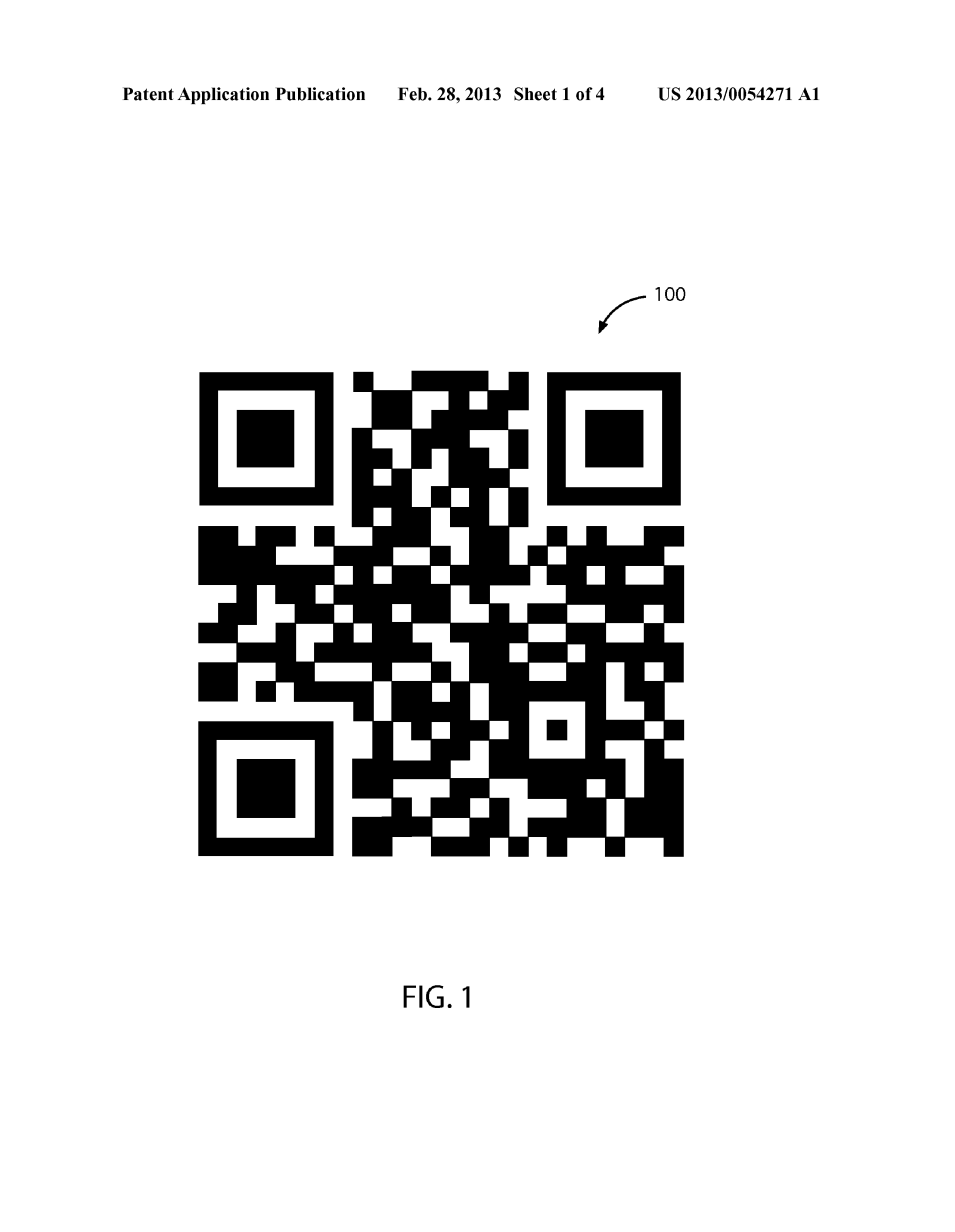 【0018】现在参照更详细的附图,图1显示出了包括计算机可读二维码示例100。QR码是一个唯一的计算机可读的二维码,包括但不限于:台式计算机,平板计算机以及智能电话。一个二维码包括排列在白色正方形图案背景上的黑色模块,并且可以通过数据集生成QR码并由任何商业上可用的应用程序来创建。