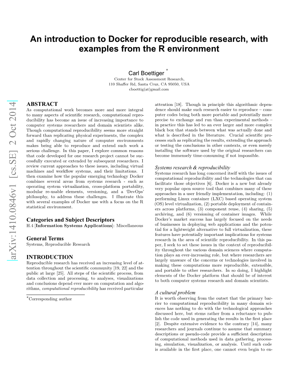 系统研究关注计算再现性问题以及便利这些东西的技术已经很长时间了。Docker是一个新兴的技术同时是非常流行的开源工具,它在用户友好的基础上组合了许多技术实现,包括:(1)基于操作系统层面的虚拟化执行Linux容器(LXC),(2)跨平台的便携的容器部署,(3)组件重用,(4)共享,(5)归档,(6)容器镜像的版本控制。与此同时,Docker市场的成功主要集中在部署Web应用的商业需求以及在完全虚拟化的轻量级的潜力上,这些特征在科学再现领域方面的研究具有潜在的重要意义。在这篇论文里,我试图在遍布各种不同领域的科学情况下,找寻Docker扮演的意义。但是这里的研发者大部分对让计算变得更加具有可重生产性,可扩展,对其他的研究人员更具有移植性的技术不那么关心。在这样做时,我突出了Docker平台那些应该对计算机系统研究以及领域科学家们有兴趣的元素。