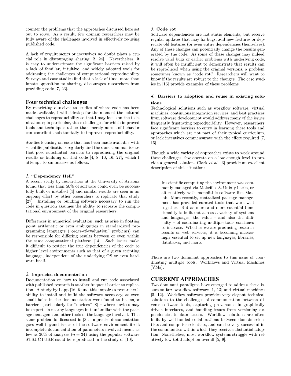 通过限制我们已经可以利用的代码的研究,我将回避再现性的文化挑战情况。所以我能集中精神在技术开发上。实际上,这些为了改善工具和技术,而不是仅仅行为的挑战能持续不断为改善再现性做出贡献。集中已经在常规科学出版的有用代码的研究发现普遍的问题,构建持续不断的障碍来减少原生结果或者构建代码。这也是我尝试在下面总结出来的。