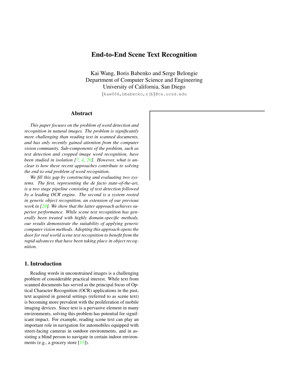 本文着重讨论自然图像中的词语检测和识别问题。 这个问题比读取扫描文档中的文本更具挑战性,并且最近才得到计算机视觉社区的关注。 该问题的子部分,如文本检测和裁剪图像字识别,已被孤立地研究[7, 4, 20]。 然而,目前尚不清楚的是,这些最近的方法如何有助于解决词语识别的端到端问题。