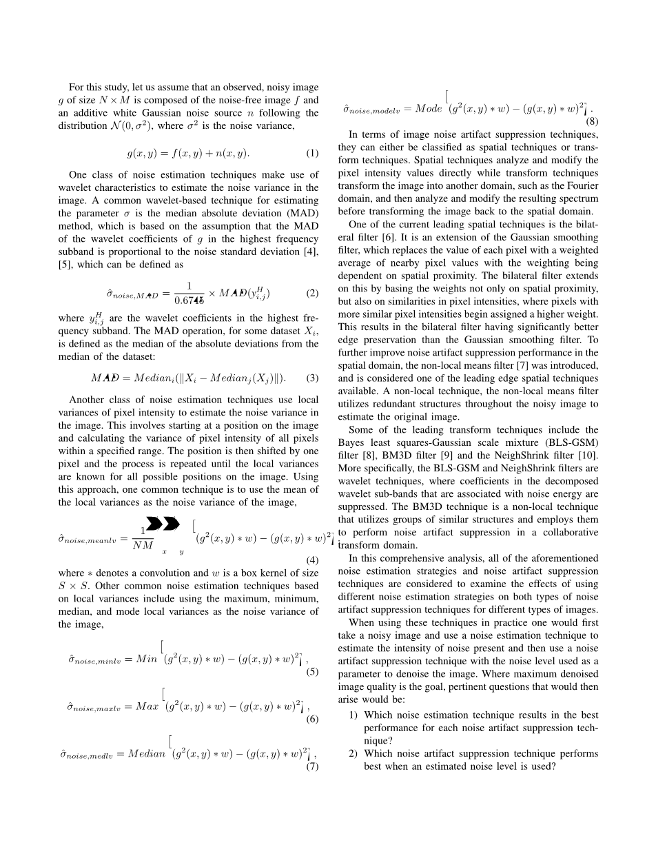 本文我们进行了综合分析,探究了不同噪声估计策略对噪声伪影抑制技术和最终图像质量的影响。经过实证分析过程,我们断定MAD微波噪声估计技术是所有给出的噪声抑制技术(BM3D,Bilateral,Neighshrink,BLS-GSM,和NLmeans)中表现最好的噪声估计技术。我们还发现当使用估计噪声电平时,BM3D噪声伪影抑制技术和MAD微波噪声估计技术相结合在所有给出的噪声伪影抑制技术中表现最优。