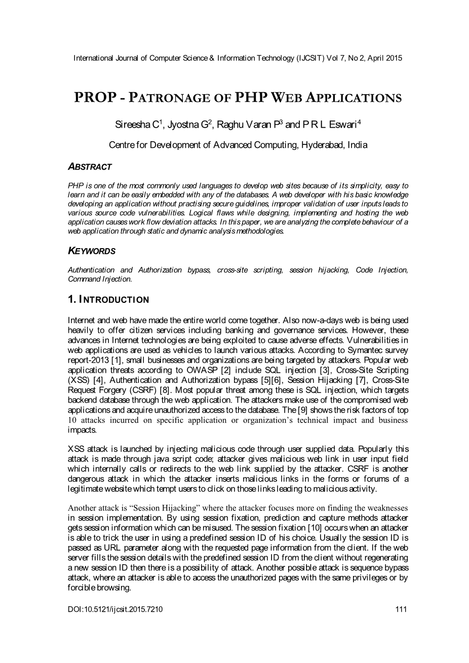 在本文中我们提出了PROP来检测源代码中的漏洞,如XSS,SQL注入,代码注入,命令注入,文件包含和文件操作攻击,防止工作流量偏差像SQL注入攻击;认证和授权旁路通过会话窃取和在运行时执行的序列旁路攻击。解决方案不干扰应用程序数据库,无需打开任何外部端口。