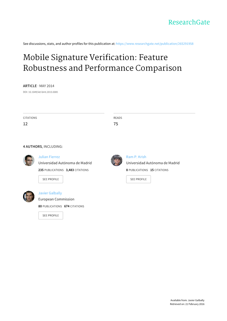 摘要:本论文研究了手持设备对自动签名验证系统的性能的影响。作者比较了移动设备和写字板,一种比较流行的研究数据采集装置,之间的整体和局部签名特征。实验基于标准签名数据库(生物安全数据库)和最先进的设备(三星Galaxy Note),结果表明手持设备的辨别力较低且错误率较高,主要原因是手持设备上笔迹性能退化。
