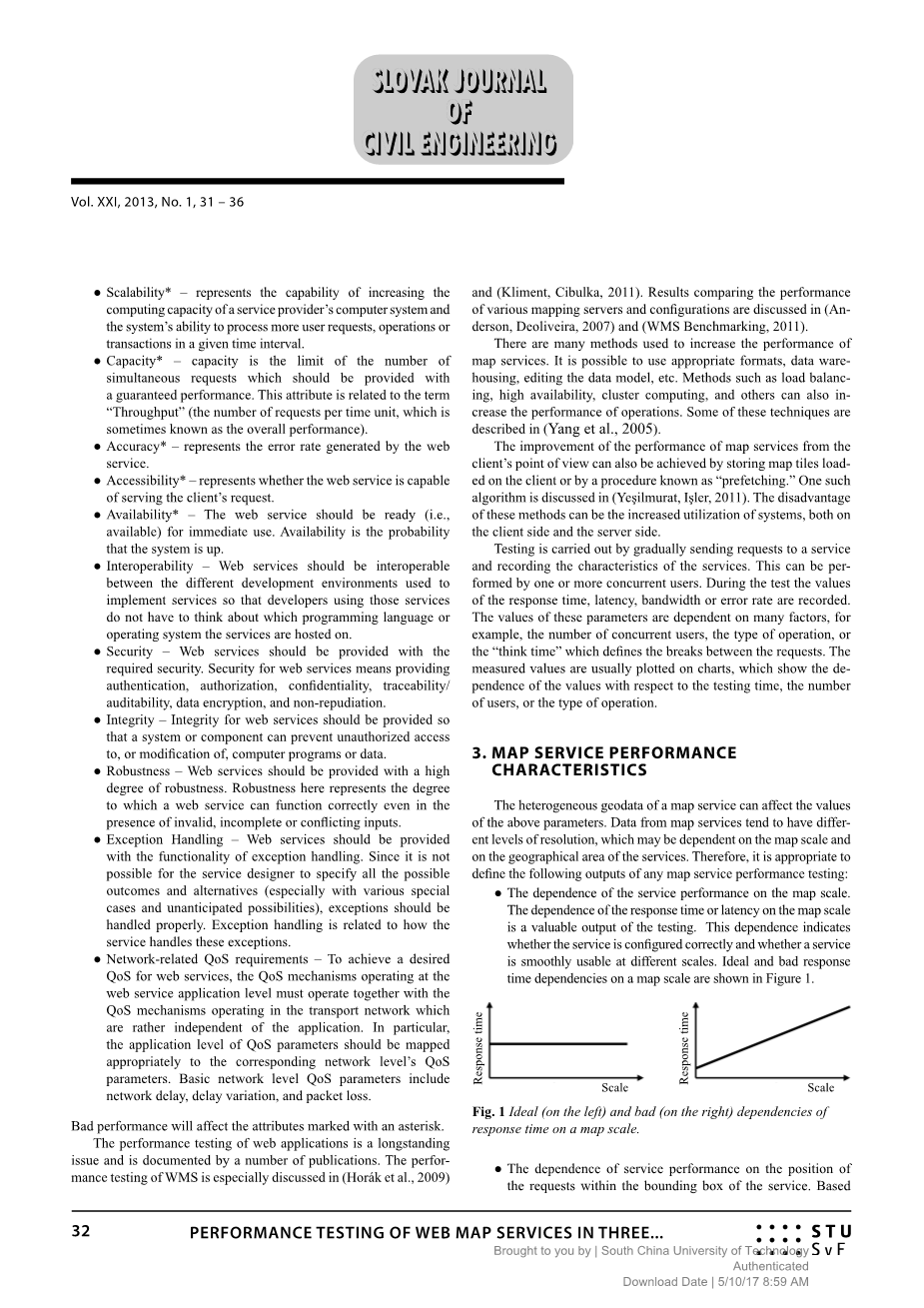 性能不佳将影响标记为星号的属性。网络应用程序的性能测试是一个长期的问题, 并由若干刊物记载。性能对网站地图服务的测试在 (Horaacute;k et al, 2009)和 (Kliment, Cibulka, 2011)中被特别讨论。比较各种映射服务器和配置的性能的结果在 (安德森,Deoliveira, 2007) 和 (wms Benchmarking, 2011)中被讨论。有许多方法用于提高地图服务性能。可以使用适当的格式, 数据仓储,编辑数据模型等。诸如负载平衡、高可用性、集群计算和其他之类的方法也可以提高操作的性能。其中一些技术是在 (杨 et al, 2005)中被描述的。通过存储地图拼贴在客户端或由称为 '预取' 的过程也可以从客户的观点中获得地图服务性能的改进。一个这样的算法在(Yeşilmurat, Işler, 2011)中被讨论。这些方法的缺点可以提高客户端和服务器端的系统利用率,通过逐步向服务发送请求来进行测试,并记录了服务的特点。可以由一个或多个并发用户执行此操作。在测试期间,在响应时间、延时、带宽或错误率等方面的数值被记录下来。这些参数的值取决于许多因素, 例如,并发用户数、操作类型或定义请求之间的断点的 '思考时间'。测量值通常以在图表上绘制的方式显示 , 图表可以显示测量值与测试时间,用户数量或操作类型的相关性。