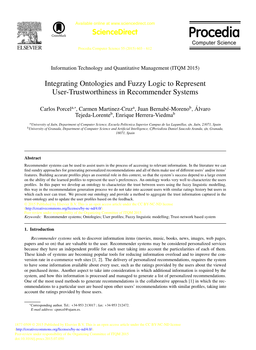 摘要:推荐系统能够帮助用户获取相关的信息。在文献中我们能找到各种生成个性化推荐的方法,所有的方法都利用不同的用户和项目的特征。本文中建立精准的模型发挥了重要的作用,建立的模型是否能够表示用户的喜好在很大程度上决定了系统的成功与否。本体能够很好地描述用户模型。在本文中,我们开发了一个本体,用来描述使用模糊语句模型的用户的可信度,这样在推荐生成过程中我们不用考虑有相似评级历史的用户,而是考虑互相信任的用户。我们提出了本体论并且提供了一种方法,这种方法聚合了在信任本体中捕获的信任信息,而且更新了基于反馈的用户模型。