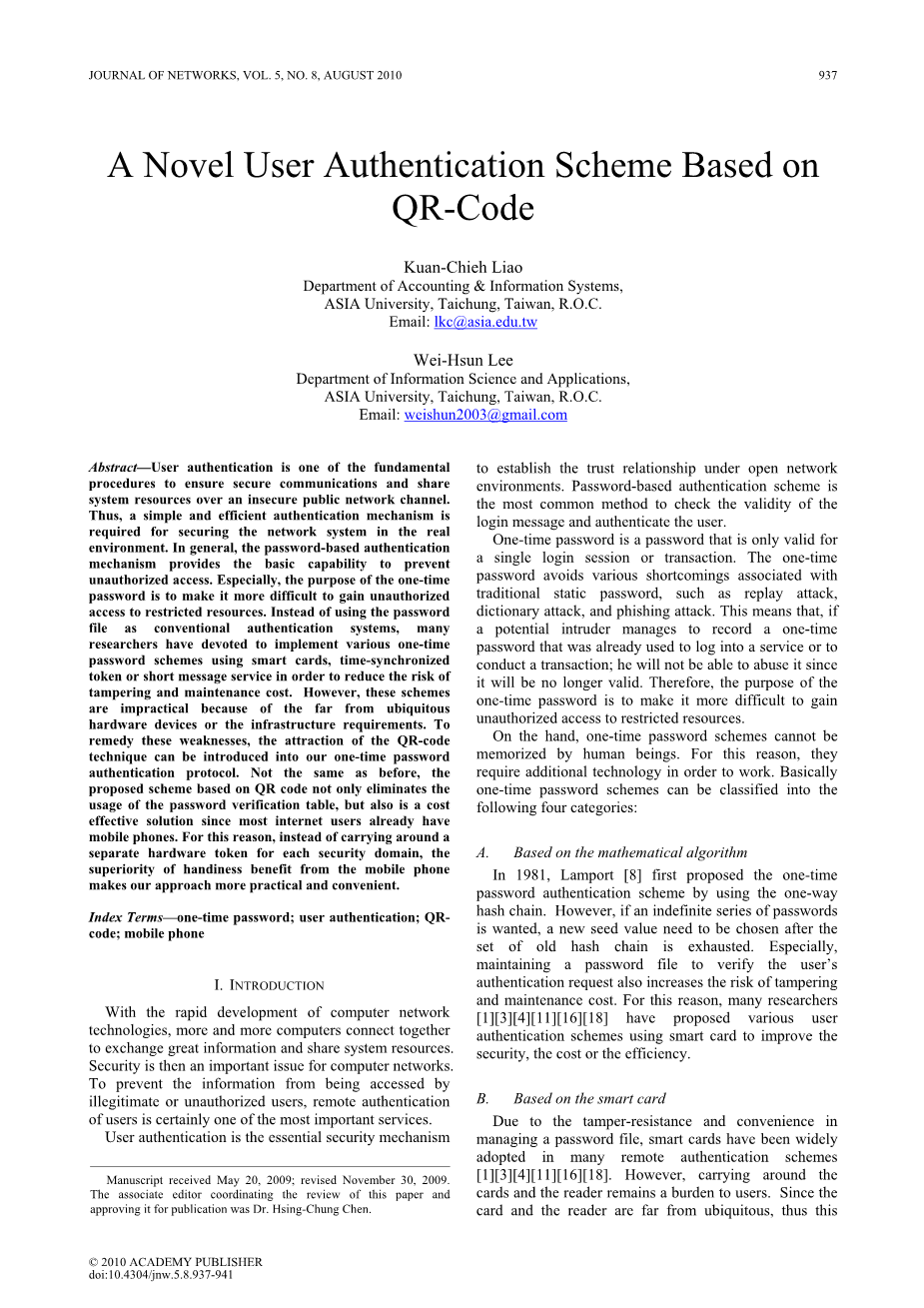 基于二维码的新型用户认证方案外文翻译资料