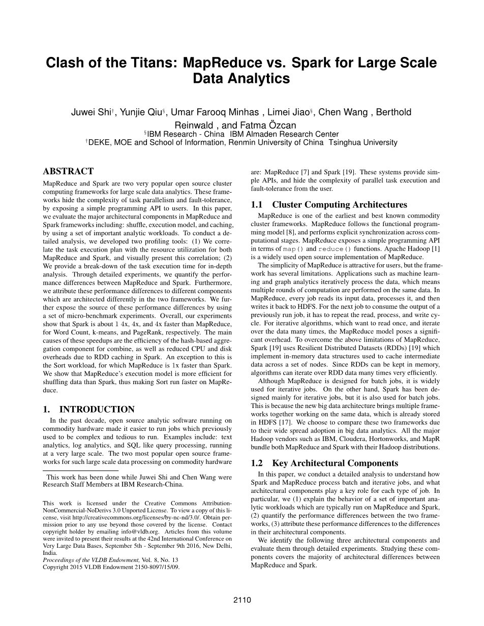 在本文中,我们进行了详细的分析,以了解如何Spark和MapReduce是如何实现处理批量和迭代工作,以及什么建筑部件在每种作业中发挥关键作用。在特别是,我们(1)解释运行在MapReduce和Spark一组通常是重要的分析工作负载的行为,(2)量化两框架之间的性能差异,(3)把这些性能上的差异,追寻到在他们的建筑构成的差异。