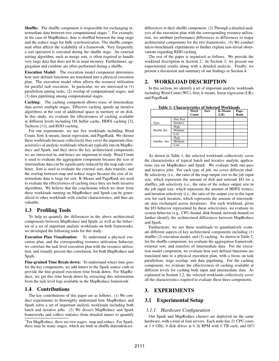 如表1所示,所选择的工作负荷集体覆盖典型的批量和反复分析应用的特点系统蒸发散在MapReduce和星火运行。 我们同时评估一通和迭代工作。 对于每种类型的工作,我们将介绍不同的shufFLE选择性(即,map输出大小的到作业输入的比率大小,其表示的磁盘和网络I / O的量要洗牌),工作选择性(即减小输出大小的比率作业输入大小,其表示HDFS的量写入),和迭代选择性(即,输出大小与输入的比率尺寸对于每次迭代,其表示各次迭代交换的数据)。 对于每个工作负荷,给这些选择性代表的I / O行为,我们评估其系统行为(例如,CPU绑定,磁盘绑定,网络绑定)到进一步明确的MapReduce之间的结构差异和Spark。此外,我们使用这些工作负载来定量evalu-吃了关键的架构组件的不同方面,包括(1)洗牌,(2)的执行模型,及(3)高速缓存。 如表2所示,对于洗牌组件,我们评估聚合框架,外部排序和中间数据的转移。 对于都是空化模型组件,我们评估用户定义的函数如何翻译成一个物理执行计划,其重点任务并行,阶段重叠,和数据流水线。 对于缓存组件,我们可以评估缓存的有效性不同级别的缓存输入和中间数据。 如1.2节解释的那样,所选的工作负载集体涵盖所有特性评定所需这三个组件。