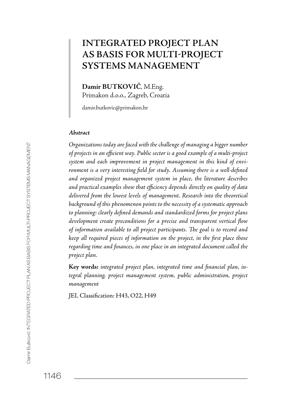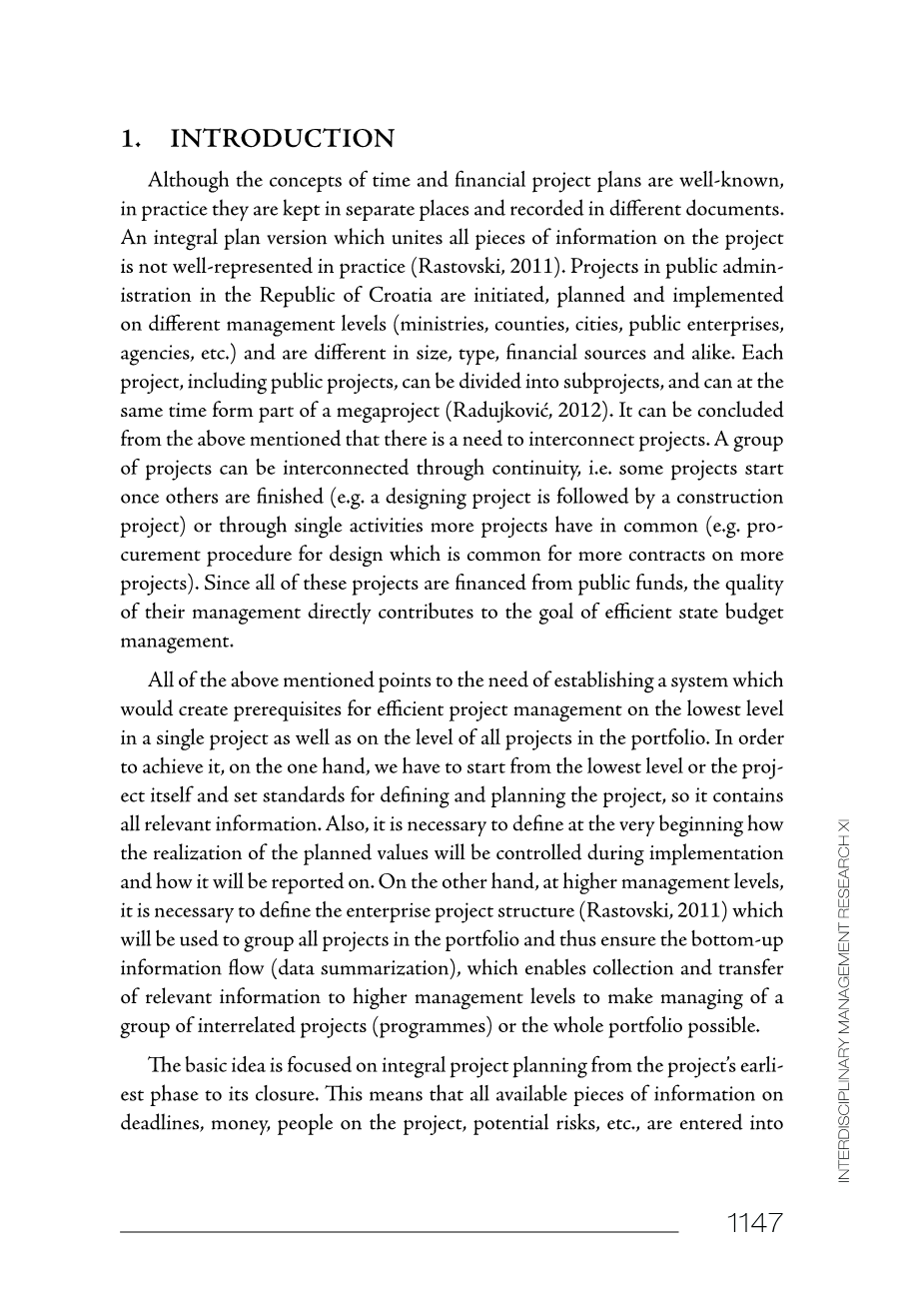 虽然时间和资金项目规划的概念是大家熟知的,但实际上他们分别存放在不同的地方,记录在不同的文件里。有一个版本的整体规划将项目所有的信息整合在一起,但在实际应用中并没有广泛的代表性。在克罗地亚,公共管理的项目由不同的管理层启动、规划和实施(政府部门,县,市,公共企业,代理机构,等等),并且类似地,它们都有不一样的规模、类型,资金来源。每个项目,包括公共项目,都可以被划分成不同的子项目,同时构成特大项目。根据上面提到的内容,我们可以得出一个结论,需要把不同的项目连接起来。一组项目可以通过连贯性连接起来,比如,一些项目在另外的项目结束时开始(比如,设计项目尾随在建筑项目之后),或者通过更多的项目共同拥有的单一活动(比如,设计的采购环节对更多的项目合同来说是都具备的)。因为所有的这些项目的资金都来源于公共基金,所以它们的管理质量直接有助于实现政府有效预算管理的目标。
