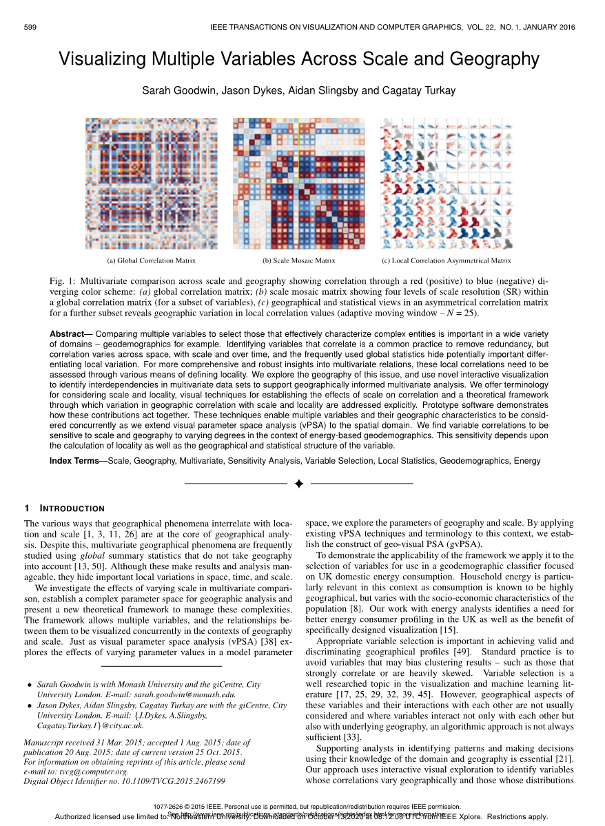 支持分析员利用他们对领域和地理的知识来识别模式和做出决策是极其重要的。我们的拟合通过交互式视觉探索来识别相关性会随着地理位置改变的变量及其分布和相关性在不同空间尺度会随之变化的变量。这启发我们能够在区域人口统计特征中运用先进的地理专业统计,数据探索以及可视化等更具体,以领域为中心的方式。我们的拟合运用新的视觉设计,使我们能够考虑在何处、如何发生以及在什么尺度上这些变量同时出现,这样地区就可以作为一种选择判别变量的方法。
