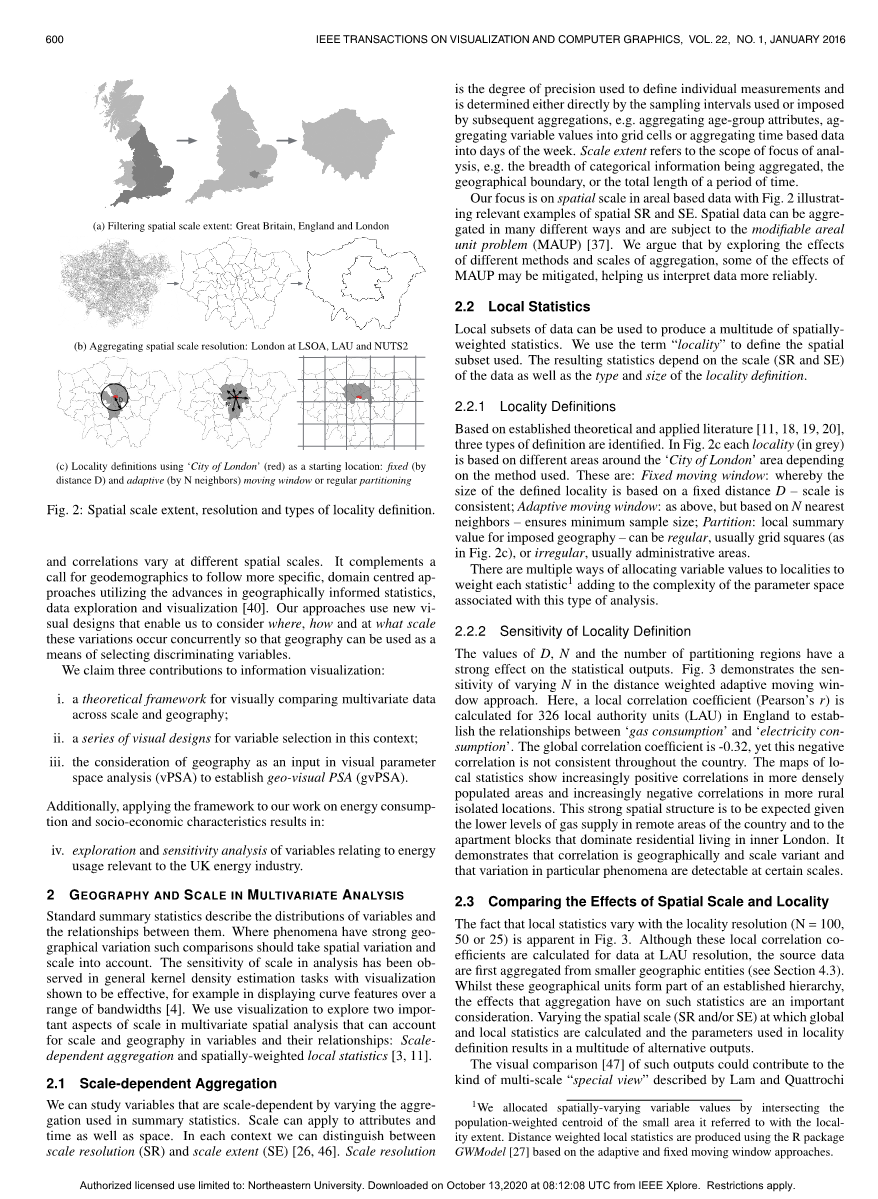 标准化汇总的统计数据描述了变量的分布以及它们之间的关系。当出现强烈地理变化的现象时,这样的比较关系应该将空间变化和规模纳入考虑范围。分析中尺度的敏感性在普遍的核密度估计任务中得到体现,可视化在展示如宽带范围内的曲线特征时表现出其有效性。我们用可视化来研究多元空间分析中尺度的两个重要方面,尺度相关聚集和空间加权局部统计,以解释变量中的尺度与地区以及它们之间的关系。