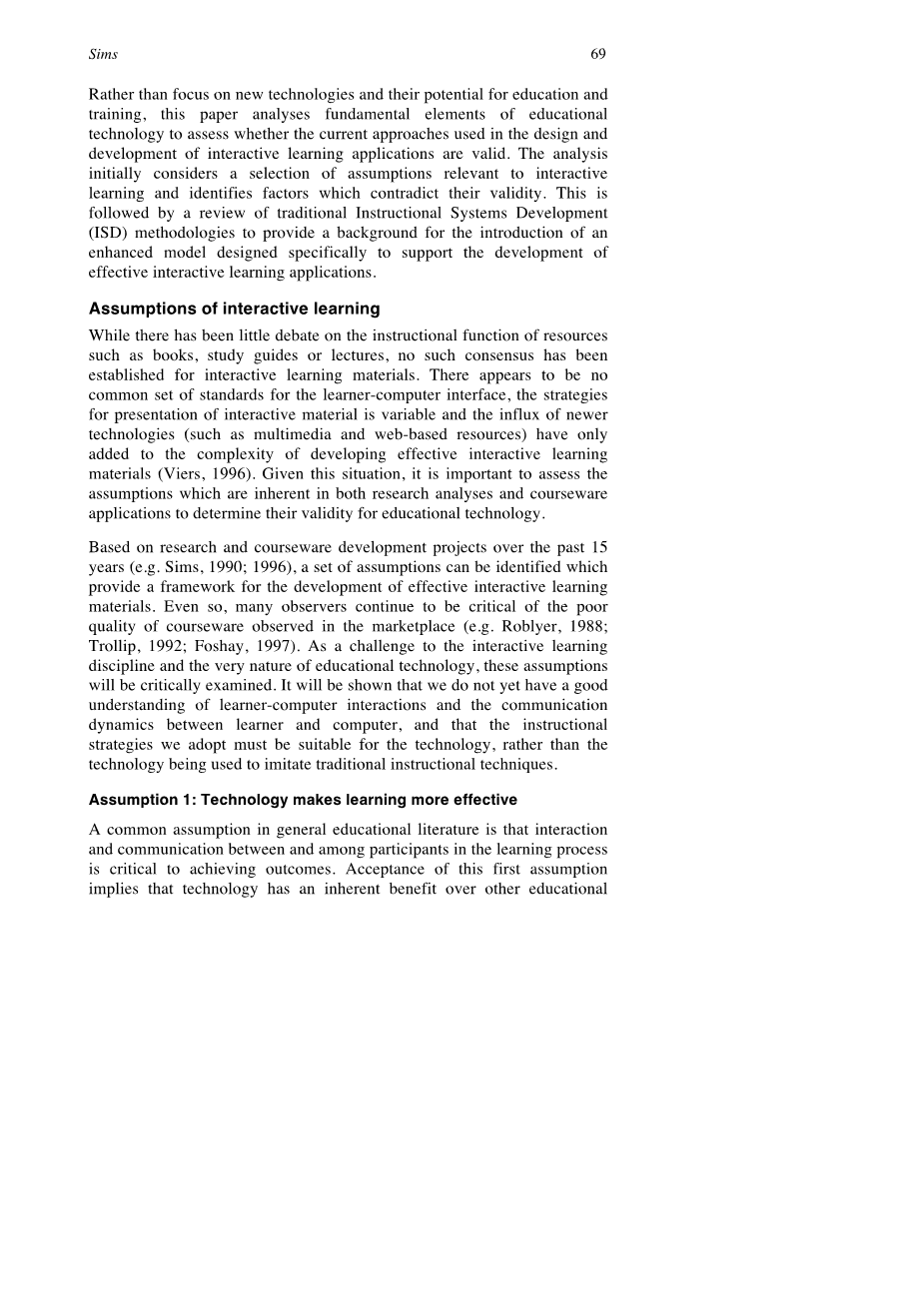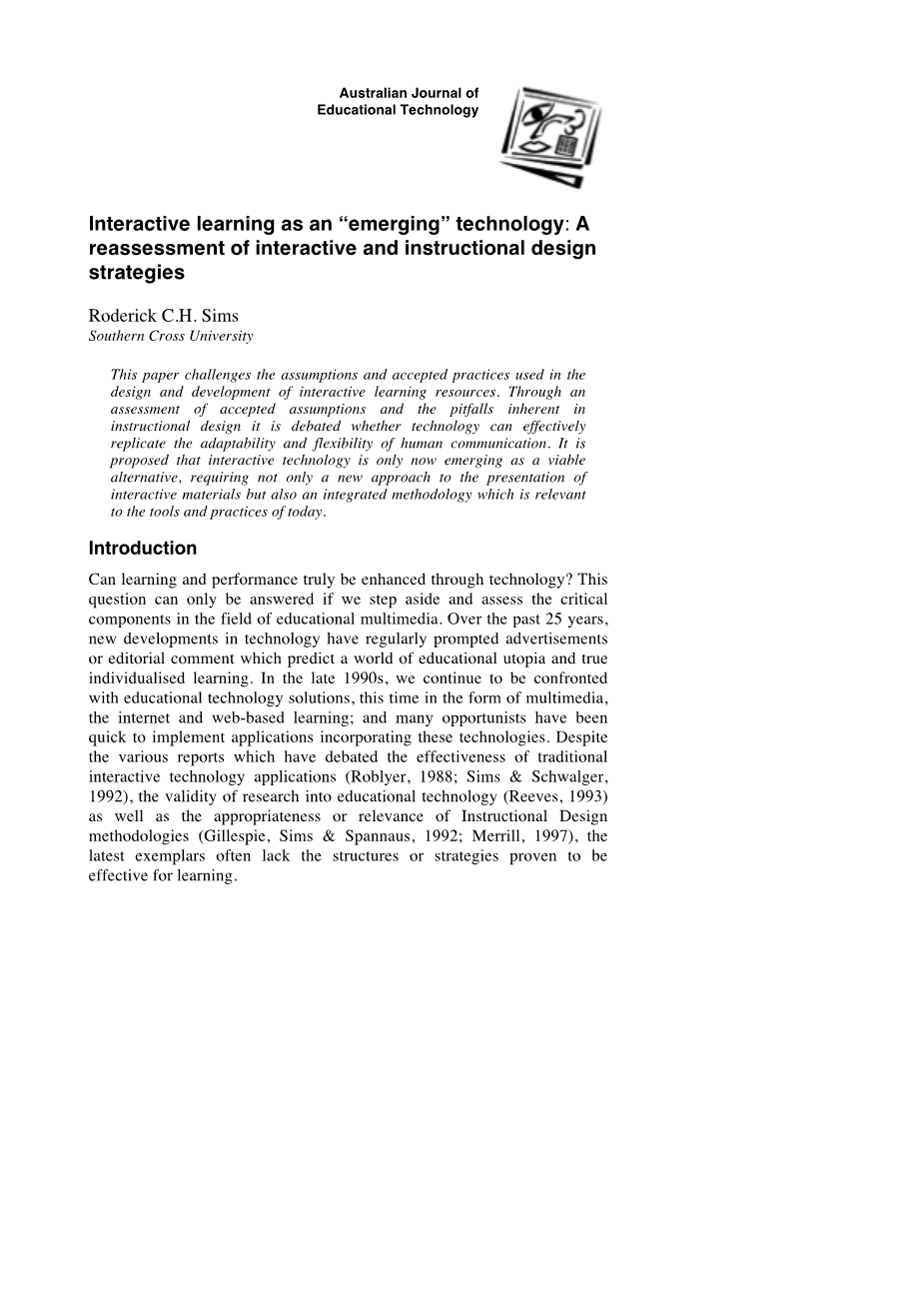 根据过去15年的研究和课件开发项目(例如Sims,1990;1996),可以确定一组假设,这些假设为开发有效的交互式学习材料提供了框架。即便如此,许多观察家仍然对市场上观察到的课件质量低劣持批评态度(例如Roblyer,1988;Trollip,1992;Foshay,1997)。作为对互动学习学科和教育技术本质的挑战,这些假设将受到批判性的检验。结果表明,我们对学习者与计算机的交互作用以及学习者与计算机之间的交流动态还没有很好的理解,我们所采用的教学策略必须与技术相适应,而不是模仿传统教学技术的技术。
