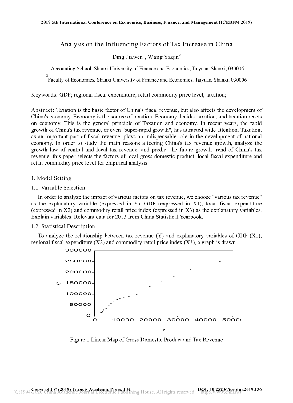税收是中国财政收入的基本因素,但也影响着中国经济的发展。经济是税收的来源。经济决定税收,税收对经济作出反应。这是税收和经济的一般原则。近年来,中国税收收入的快速增长,甚至是“超级快增长”,引起了广泛的关注。税收作为财政收入的重要组成部分,在国家的经济发展中扮演着一个不可或缺的角色。为了研究中国税收收入增长的主要原因,分析中央和地方税收收入的增长规律,并预测中国税收收入的未来增长趋势,本文选择了地方国内生产总值、地方财政支出和零售商品价值水平进行实证分析。
