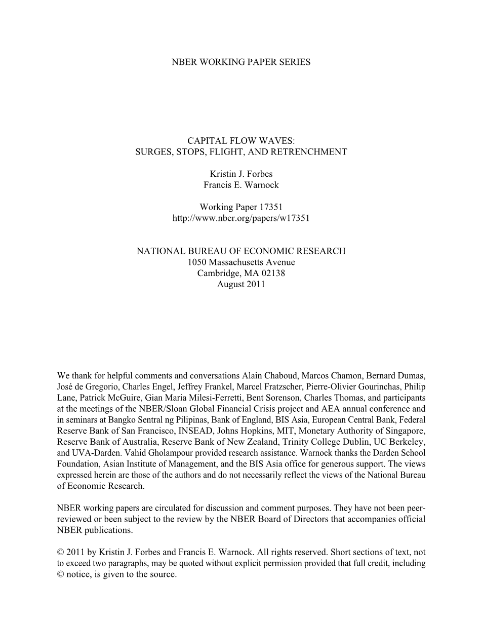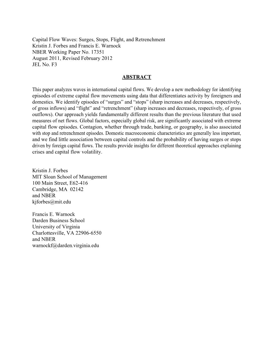 本文建立了一个数据库,当国内外投资者大量增加或减少流入或流出一国的资本流入时,我们称之为“激增”,“中断”,“外逃”和“回流”。 有关总流入和总流出的基本季度数据涵盖从1980年(最早)到2009年的时期,其中包括50多个新兴经济体和发达经济体。使用该数据库,我们记录了按收入水平和地区划分的极端资本流动随时间变化的每种事件的发生率。我们认为,随着全球投资者清算外国投资头寸并将资金带回国,发生了最近空前的中断和回流危机。