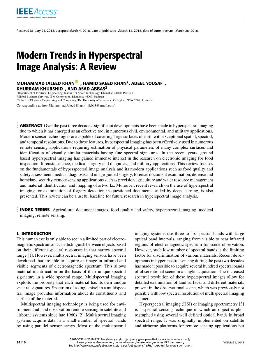 索引术语:农业,文件图像,食品质量和安全,高光谱影像,医学影像,遥感。