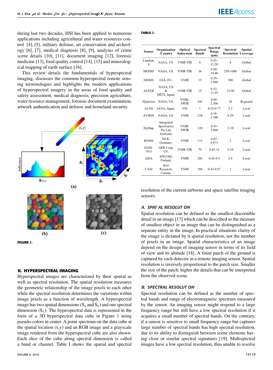 高光谱图像的特征在于其空间以及光谱分辨率。空间分辨率测量图像像素之间的几何关系,而光谱分辨率则决定图像像素内部随波长的变化。高光谱图像具有两个空间维度(Sx和Sy)和一个光谱维度(S)。高光谱数据在图1中以三维高光谱数据立方体的形式表示,中心使用伪色。还显示了空间位置(x,y)数据立方体上的点光谱,以及由超光谱立方体渲染的RGB图像和灰度图像。立方体的每个切片沿着光谱维度称为波段或通道。表一显示了当前机载和太空卫星成像传感器的空间和光谱分辨率。