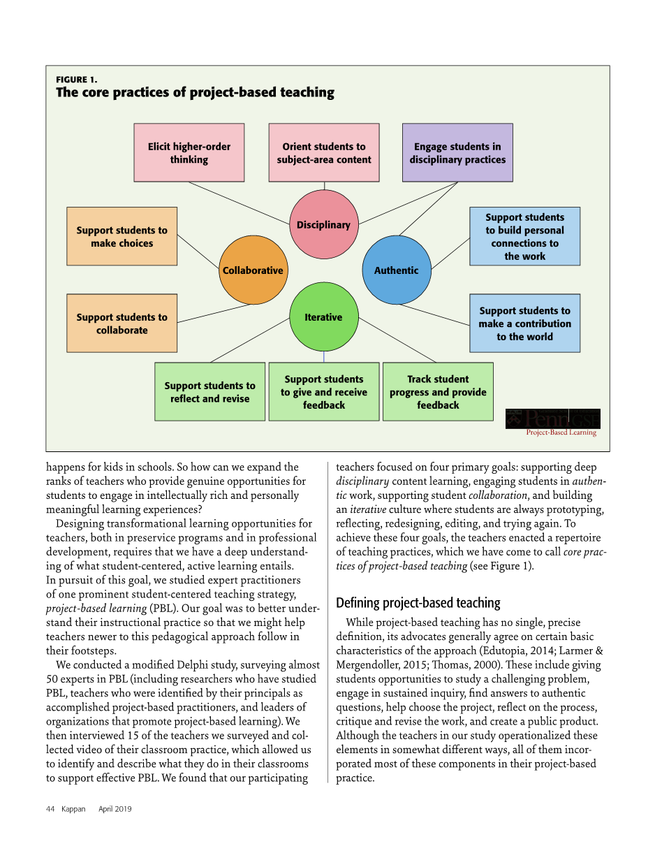 我们进行了一项修改过的德尔菲研究,调查了近50名PBL专家(包括研究过PBL的研究人员、被校长认定为有成就的基于项目的实践者的教师,以及促进基于项目学习的组织的领导者)。然后,我们采访了15名接受调查的教师,并收集了他们课堂实践的视频,这让我们能够识别和描述他们在课堂上做了什么来支持有效的PBL。我们发现,我们的参与教师专注于四个主要目标:支持深入的学科内容学习,让学生参与真实的工作,支持学生协作,建立一个迭代的文化,学生总是在原型、反思、重新设计、编辑和再次尝试。为了实现这四个目标,教师制定了一系列的教学实践,我们称之为基于项目教学的核心实践(见图1)。