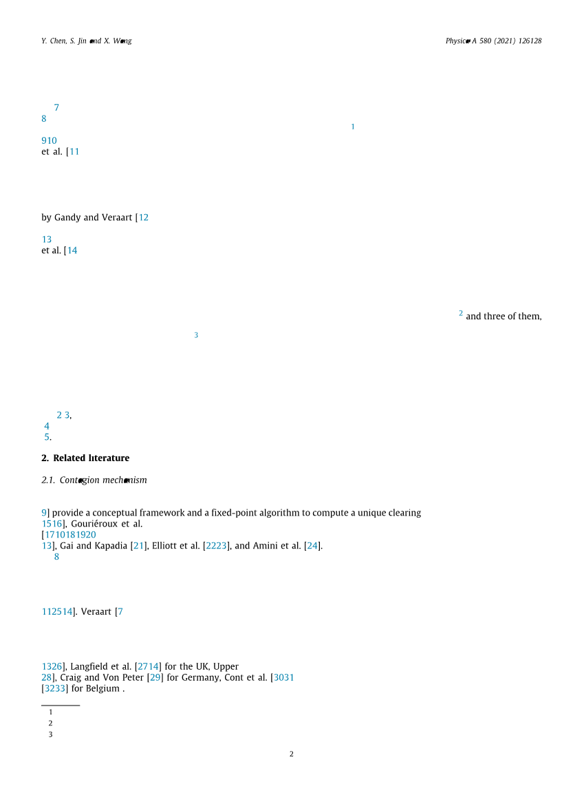 大量的文献表明只有在违约之后,损失才会从一家银行传播到其他银行。例如,Eisenberg和Noe[9]提供了一个概念框架和一个定点算法来计算唯一的清算支付向量。这有很多的拓展延伸,如Suzuki [15],Cifuentes等人。[16],Gourieroux 等人[17], Rogers和Veraart[10],Fischer[18], Feinstein[19], Weber和Weske[20]和一些级联模型,例如Furfine[13],时至今日,Kapadia[21], Elliott等人。[22],Afonso和Shin [23], Amini等人。[24]。