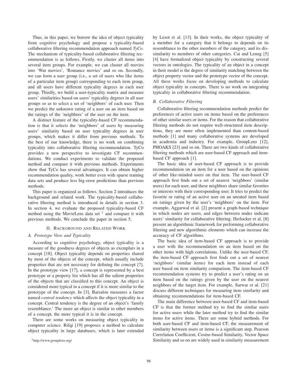 本文的结构如下。第2节介绍了研究背景和相关工作。第3节详细介绍了基于典型性的协同过滤方法。在第4节中,我们使用MovieLens数据集1评估了所提出的基于典型性的CF方法,并将其与以前的方法进行了比较。我们在第5节总结了本文。