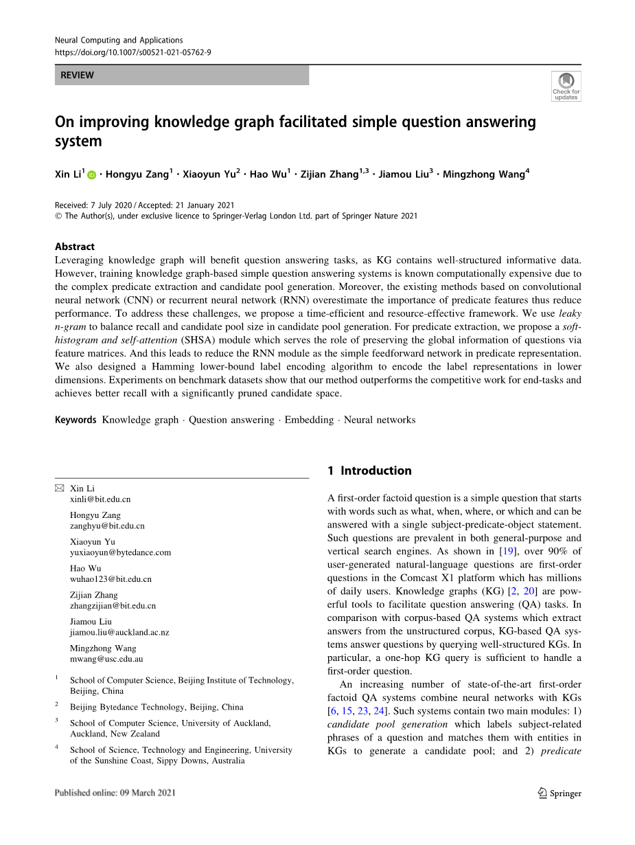 一阶事实性问题是一种简单问题,它以诸如什么、何时、在何处或什么之类的词开始,并且它可以用单一的主语-谓词-对象语句来回答。这类问题在通用搜索引擎和垂直搜索引擎中都很普遍。如[19]所示,超过90%的用户生成的自然语言问题都是康卡斯特X1平台上的一级问题,该平台拥有数百万的每日用户。知识图谱(KG)[2,20]是帮助完成问题回答(QA)任务的强大工具。与从非结构化语料库中提取答案的基于语料库的QA系统相比,基于KG的QA系统通过查询结构良好的KG来回答问题。特别是,一个一跳的KG查询就足以处理一个一阶问题。