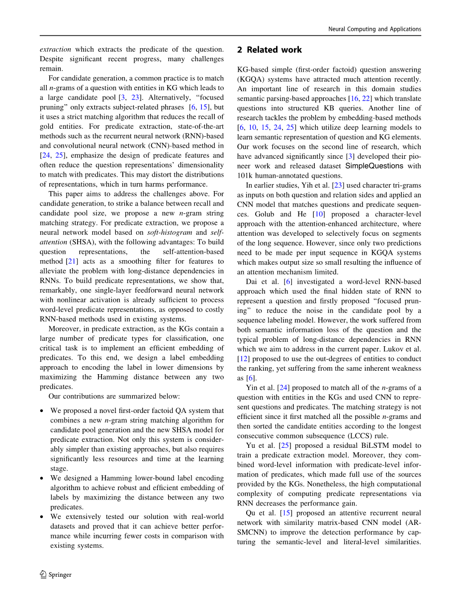 Dai 等人[6]研究了一种基于单词级RNN的方法,该方法使用RNN的最终隐藏状态来表示一个问题,并首先提出了“集中剪枝”,通过序列标记模型来减少候选池中的噪声。然而,这项工作遇到了语义信息丢失和典型的RNN远程依赖问题,我们在本文中旨在解决这个问题。Lukov等人[12]提出使用实体的外度来进行排名,但也存在与[6]相同的固有缺点。