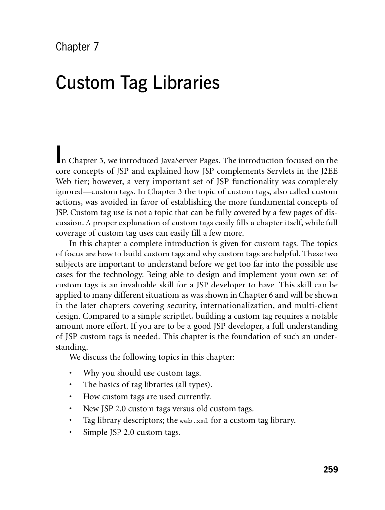 这是较长的章节之一;但是,您不应该直接通读整个内容。只有前半章,一直到“简单”标签和.tag文件的讨论,并且最后几个主题,标签库侦听器和标签库验证都是必需的;提供有关经典自定义标签的完整讨论只是为了完整性。如果您只想知道本书后面章节需要什么(即开发新的Web应用程序时可能需要什么),请随意跳过关于JSP2.0之前的自定义标签的讨论,但请注意几乎所有现有的自定义标签库是通过经典的自定义标签实现的。如果您想成为一名消息灵通的JSP开发人员,您肯定会从通读整章中受益。