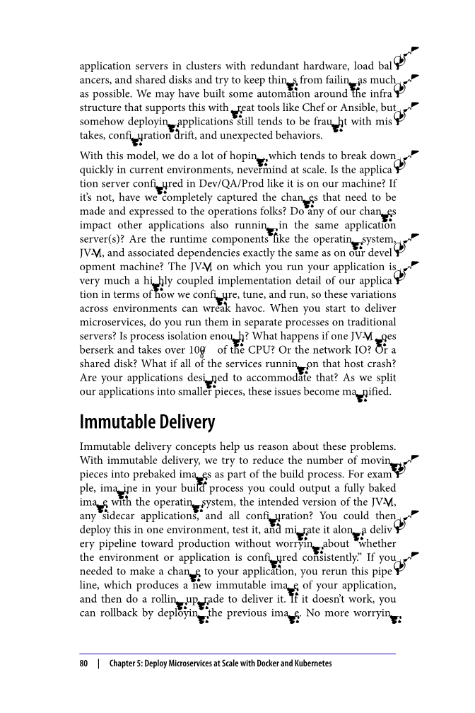 不变的交付概念有助于我们对这些问题进行推理。对于不可变的交付,作为构建过程的一部分,我们尝试减少移动到预烘焙图像中的片段的数量。例如,假设您在构建过程中可以输出操作系统,JVM的预期版本,任何附带工具应用程序以及所有配置的完全烘焙的映像?然后,您可以将其部署在一个环境中,进行测试,然后沿着交付管道将其迁移到生产环境,而不必担心“环境或应用程序是否配置一致”。如果您需要对应用程序进行更改,则可以重新运行该管道,这将生成应用程序的新的不变映像,然后进行滚动升级以交付它。如果不起作用,则可以通过部署上一个映像进行回滚。