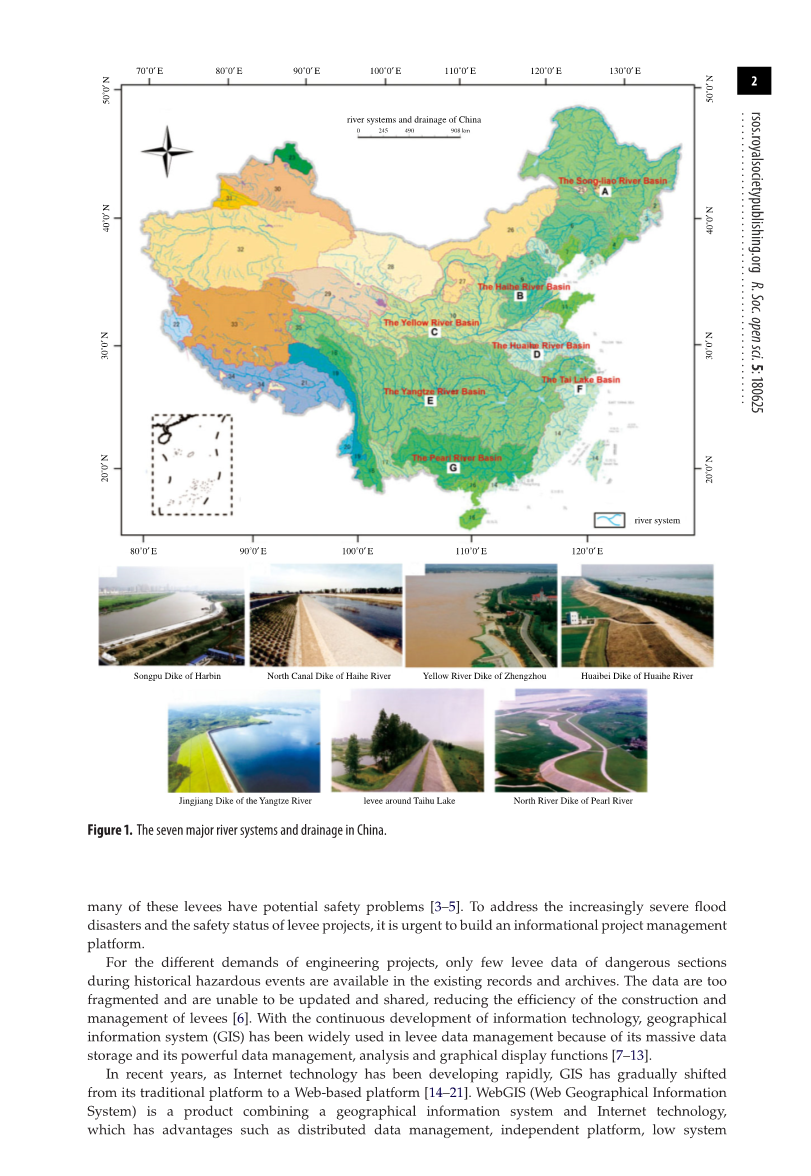 随着人类生产力和生活水平的提高,水资源的开发和管理已成为全球关注的重大问题[1,2]。目前,我国七大流域分布着各类堤防工程0.25times;106公里以上(如图1),这些堤坝中有许多存在潜在的安全问题[3-5]。针对日益严重的洪涝灾害和堤防工程的安全状况,迫切需要建设信息化的工程管理平台。