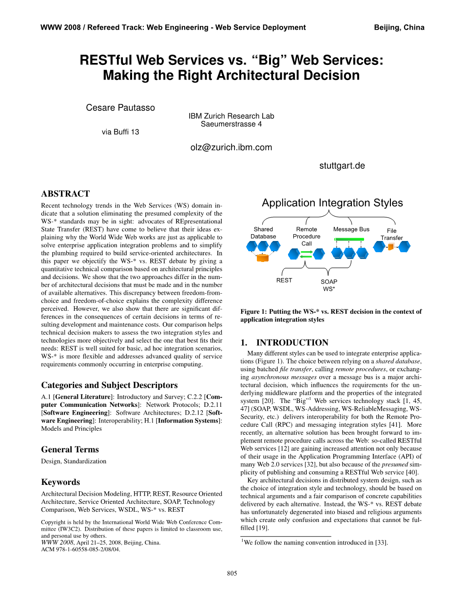 可以使用许多不同的样式来集成企业应用程序(图1)。在依赖共享数据库,使用批处理文件传输,调用远程过程或通过消息总线交换异步消息之间进行选择是一项重大的体系结构决策,这会影响对底层中间件平台的需求以及集成系统的属性[20]。 “ Big” Web服务技术堆栈[1、45、47](SOAP,WSDL,WS-Addressing,WS-ReliableMessaging,WSSecurity等)为远程过程调用(RPC)和消息传递集成样式提供了互操作性[ 41]。最近,提出了另一种解决方案来在Web上实现远程过程调用:所谓的RESTful Web服务[12]越来越受到关注,这不仅是因为它们在许多Web 2.0服务[32]的应用程序编程接口(API)中的使用,也因为发布和使用RESTful Web服务[40]的更加简单。