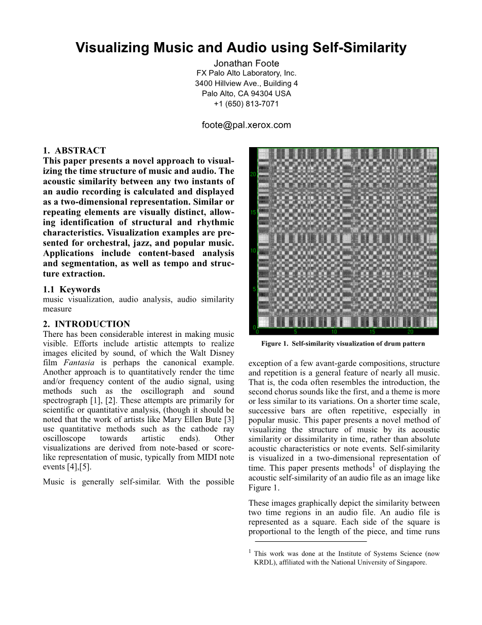 音乐通常是自我相似的。除去一些前卫的作品,结构和重复的几乎是所有的音乐的一般特征。也就是说,结尾通常类似于介绍,第二合唱听起来像第一合唱,并且一个主题或多或少和变奏是类似的。在较短的时间尺度上,连续的东西往往是重复的,尤其是流行音乐。本文介绍的是一种通过时间上声音的相似性和不相似性可视化音乐结构,而不是通过绝对的声学特性或音符的新方法。自我相似性在时间的二维表示中可视。本文提出显示音频文件的声学自相似性为图1的方法。
