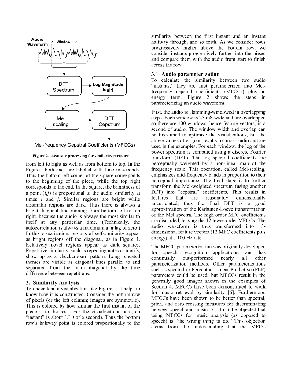 本文提出了一种新的方法,用以可视化音乐和音频的时间结构。音频记录的任何两个时刻之间声音相似性被计算并用二维表示出来。类似或重复的元素在视觉上是不同的,允许结构和节奏特征识别。可视化例子举出了交响乐,爵士乐和流行音乐。包括基于内容的分析的应用,以及节奏结构和提取。
