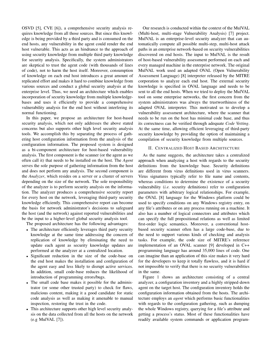 我们的研究是在MulVAL(多主机、多级脆弱性分析)项目中进行。MulVAL是企业级安全分析软件,对在终端机上发现漏洞基于网络的企业,它可以自动计算所有可能的多步骤、多主机攻击路径。MulVAL的输入是在企业网络中对每一个管理的机器执行基于主机的漏洞评估的结果。最初的MulVAL工作使用一种由MITRE公司分析每一个终端后发布的已经适应的OVAL语言(开放的漏洞评估语言)注释器。外部安全知识在OVAL语言中已经确定,并且需要发送到所有终端。当我们试图在一些企业网络中部署MulVAL工具,系统管理员首先担心的总是适应OVAL解释器的可信度。这促使我们去开发一个漏洞评估体系,其中扫描仪能在有最小的代码库的主机上运行,因此通过适当的代码审查可以验证它的正确性。同时,通过提供获得一个多源的安全知识编译的选择高效的利用第三方安全知识。