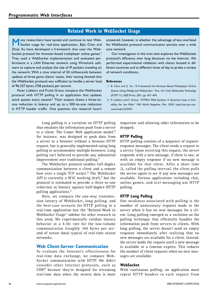如果消息传输间隔已知,则HTTP轮询被视为传递实时信息的良好解决方案——即当数据传输速率恒定时,如当发送传感器读数例如每小时的温度或水位时。在这种情况下,应用程序开发人员可以在已知数据可用时同步客户端以请求数据。然而,当速率增加时,HTTP轮询重复有效的报头信息的固有开销又增加了时延。由于实时HTTP Web应用的复杂性,早期的研究假设HTTP不是为实时的全双工通信而设计的[3]。因此,HTTP只能以高代价——增加时延,高网络流量来模拟实时通信。