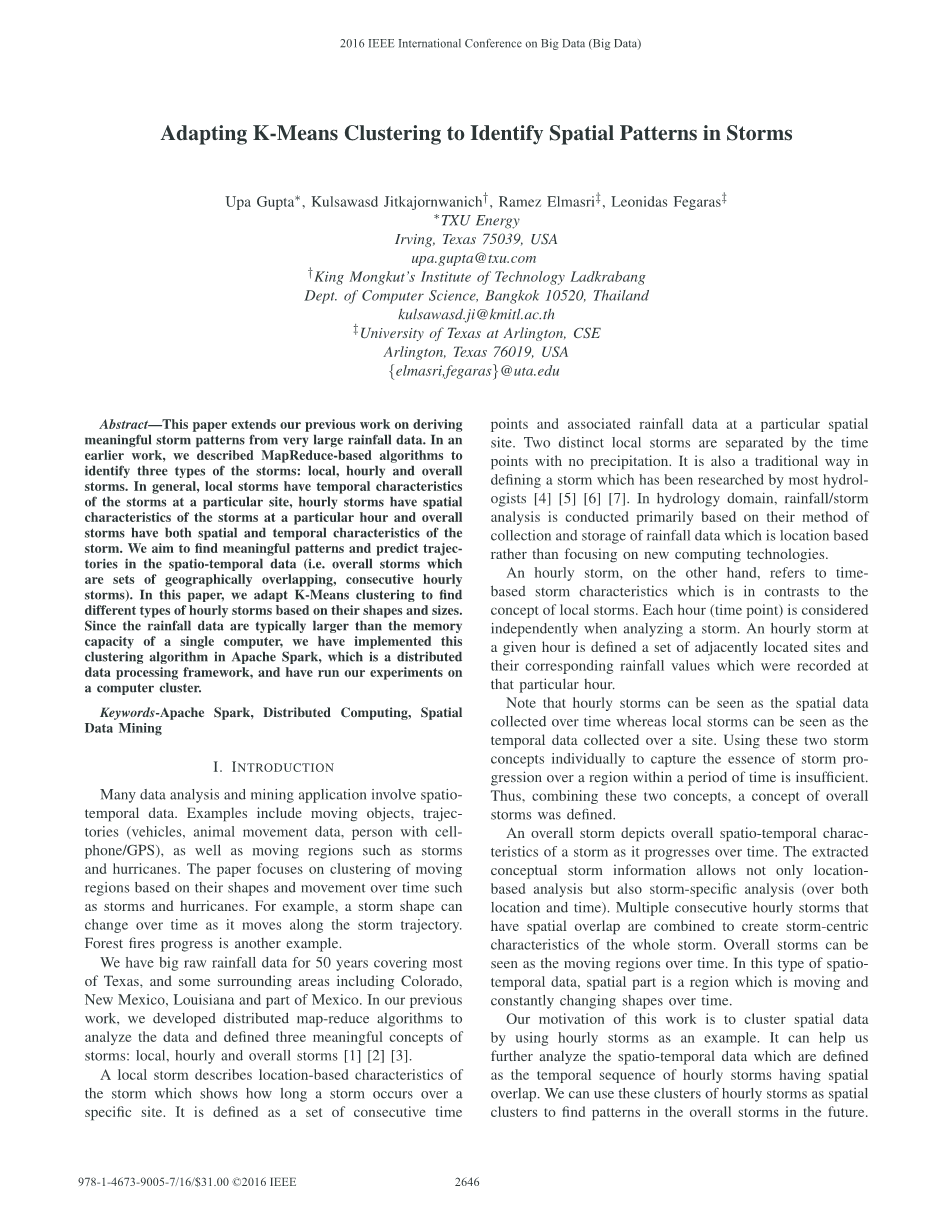 摘要——我们早期的工作通过极大量的降雨数据获得了规律性的风暴模式,本文对早期工作进行了延伸。在早期的工作中,我们描述了基于MapReduce的算法识别出的三类风暴:局部,小时性和整体风暴。在一般情况下,局部风暴在一个特定地点具有时间特征,小时性风暴在一个特定时间具有空间特征,而整体风暴同时具有空间和时间特征。我们的目标是,在时空数据(整体风暴是地理重叠,连续每小时的风暴的集)中挖掘到规律性模式和预测轨迹。在本文中,基于风暴的形状和大小,我们采用k-均值聚类来发掘不同类型小时性风暴。由于降雨数据通常大于单个计算机的内存容量,我们通过分布式数据处理框架Apache Spark实现该算法,并在计算机集群上运行实验。