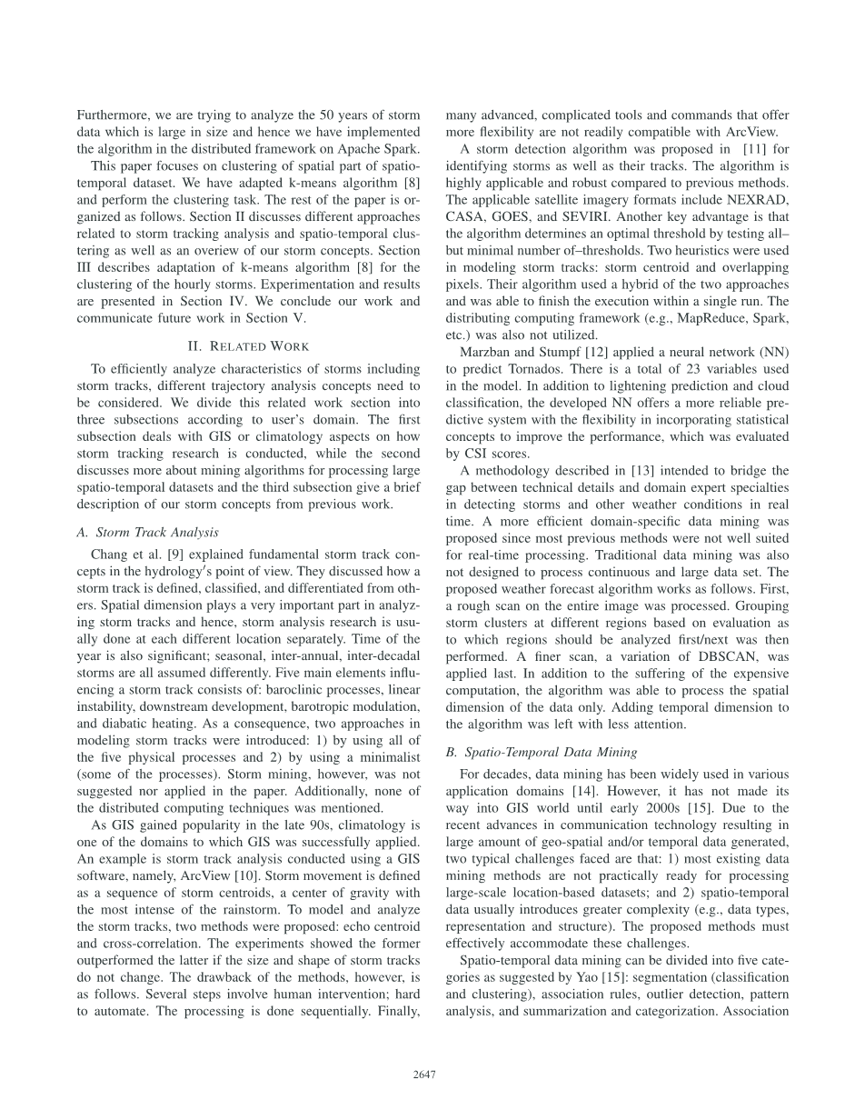 为了有效地分析风暴,包括风暴轨道的特点,需要考虑不同轨迹分析的概念。根据用户的域,我们把相关工作分为三部分。第一部分在GIS或气候学方面对风暴进行了跟踪研究,其次用挖掘算法处理了大规模时空数据集,并在第三节寄托之前的工作介绍了风暴概念。