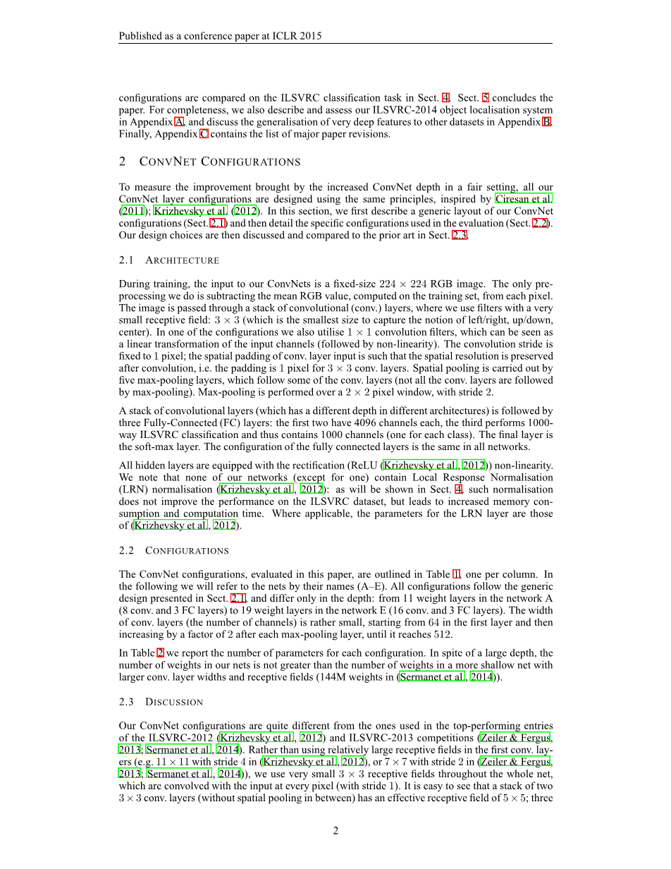 本文的其余部分组织如下。在第2部分,我们描述我们的ConvNet的配置。图像分类训练和评估的细节展示在第3部分。关于ILSVRC分类任务的配置比较是在第4部分。第5节总结本文。为了完整性,我们还在附录A中描述和评估了我们的ILSVRC-2014目标定位系统,并在附录B中讨论了对其他数据集的深层特征的泛化能力。最后,附录C包含了主要论文修定版本的列表。