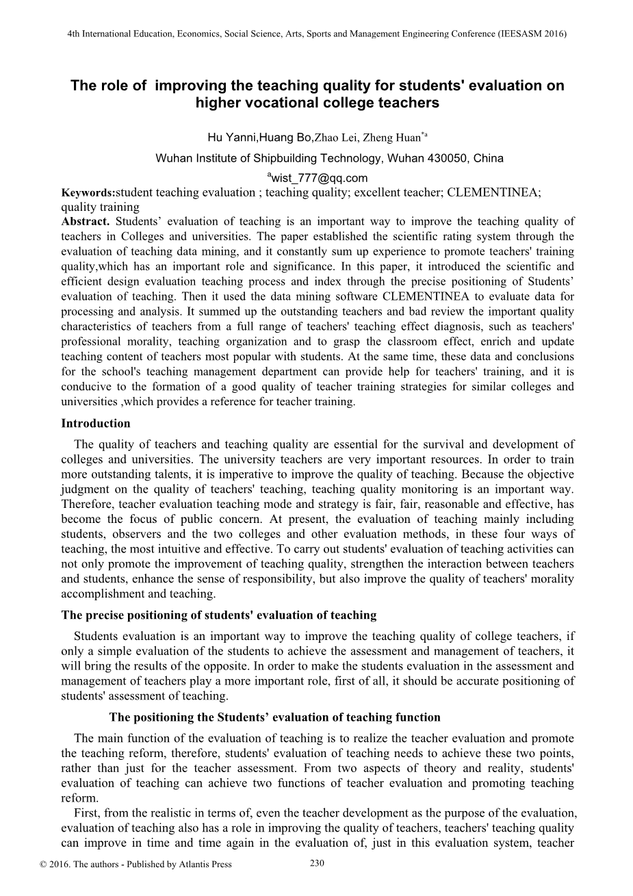关键词:学生教学评价; 教学质量; 优秀的老师;CLEMENTINEA; 质量培训