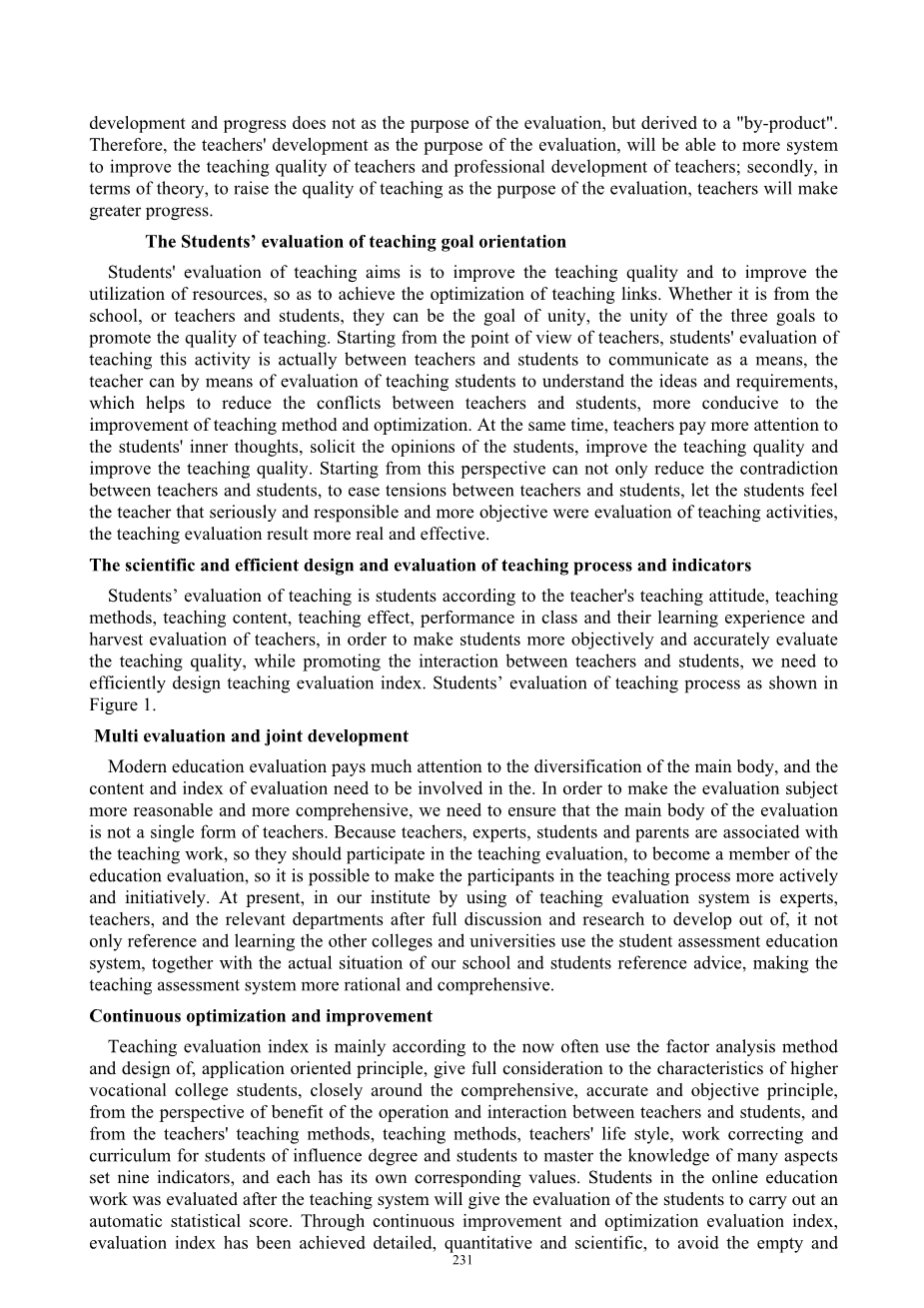 首先,从现实情况来看,即使以教师发展为评价目的,教学评价也对提高教师素质起到了一定的作用,教师的教学质量可以在评价中一次又一次地提高,只是在这个评价体系中,教师的发展和进步并不是评价的目的,而是衍生于“副产品”。因此,以教师发展为评价目的,将能够通过更多的制度来提高教师教学质量和教师专业发展水平;其次,就理论而言,为提高教学质量作为评估的目的,教师将取得更大的进步。