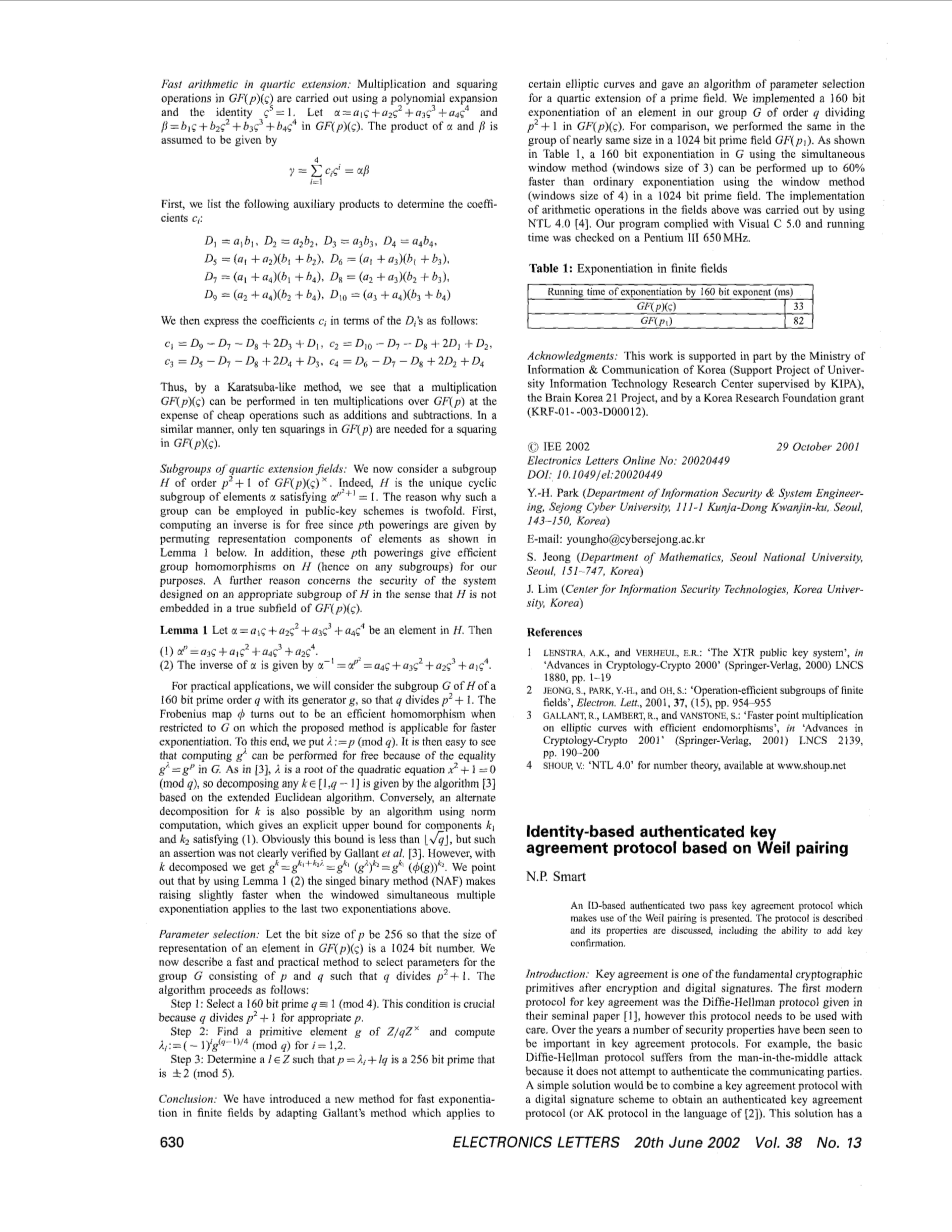 结论:我们提出了一个使用韦伊配对的基于身份认证的密钥协商机制。另外,我们也展示了如何在基本协议中添加密钥认证。